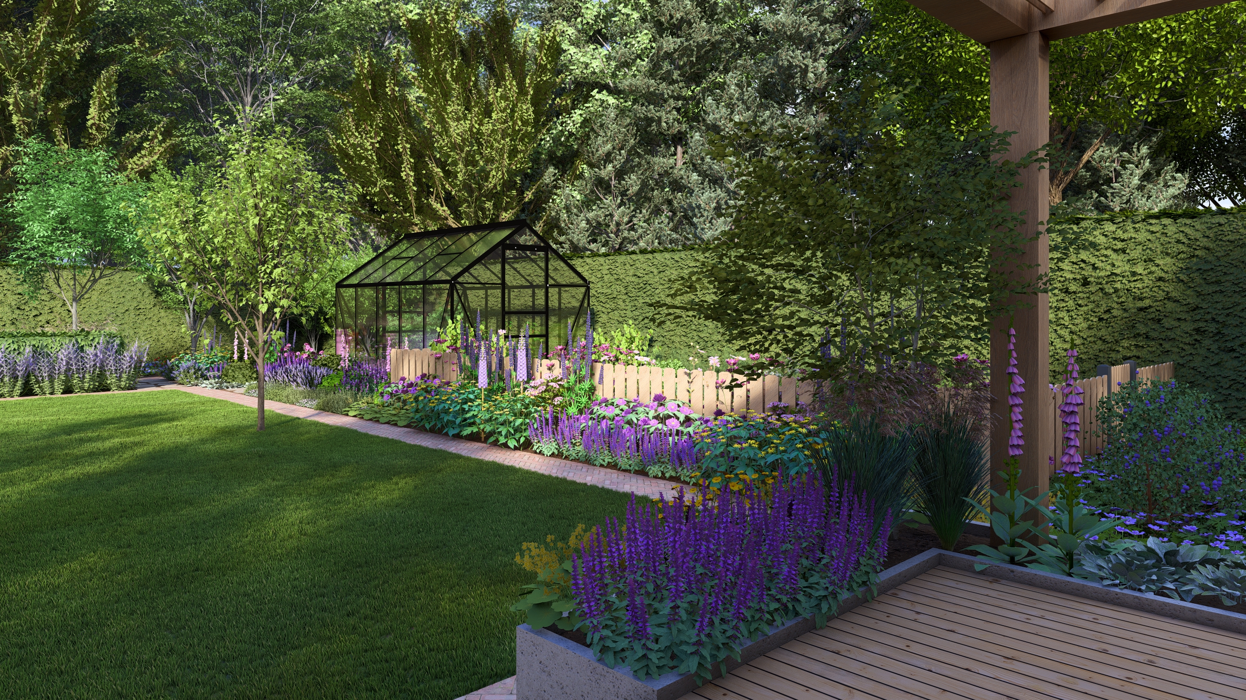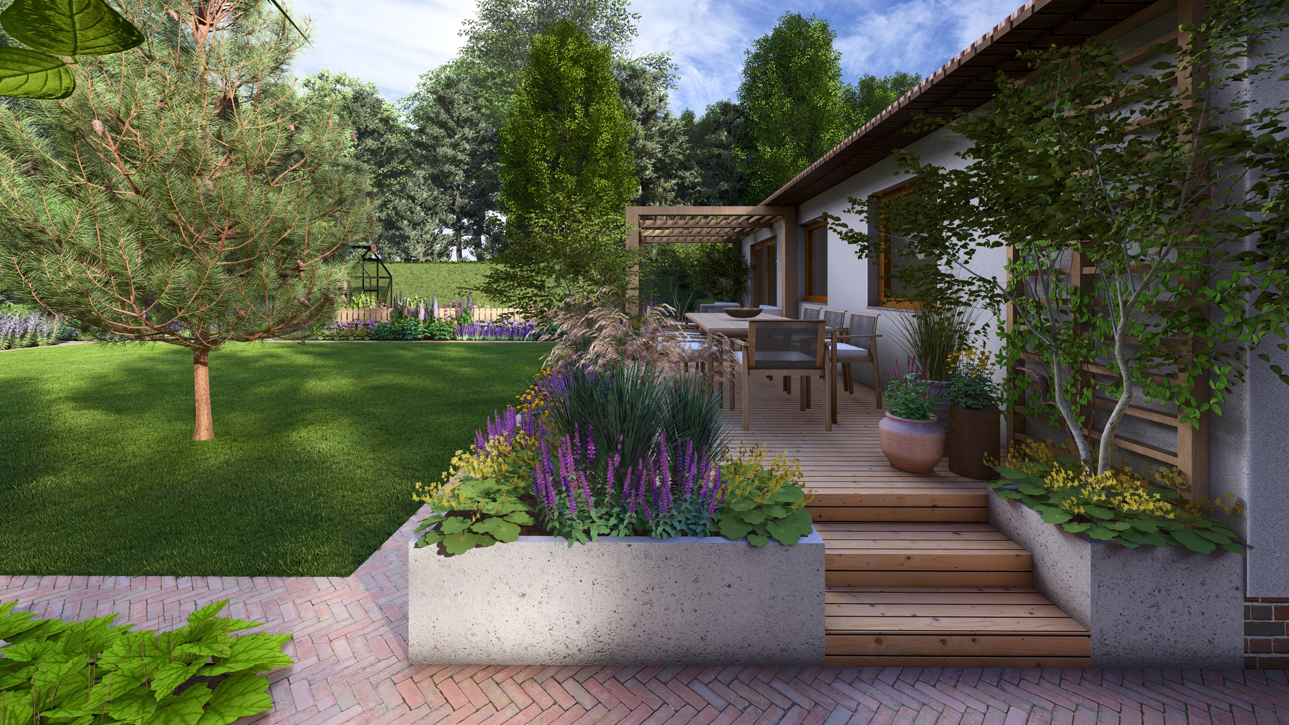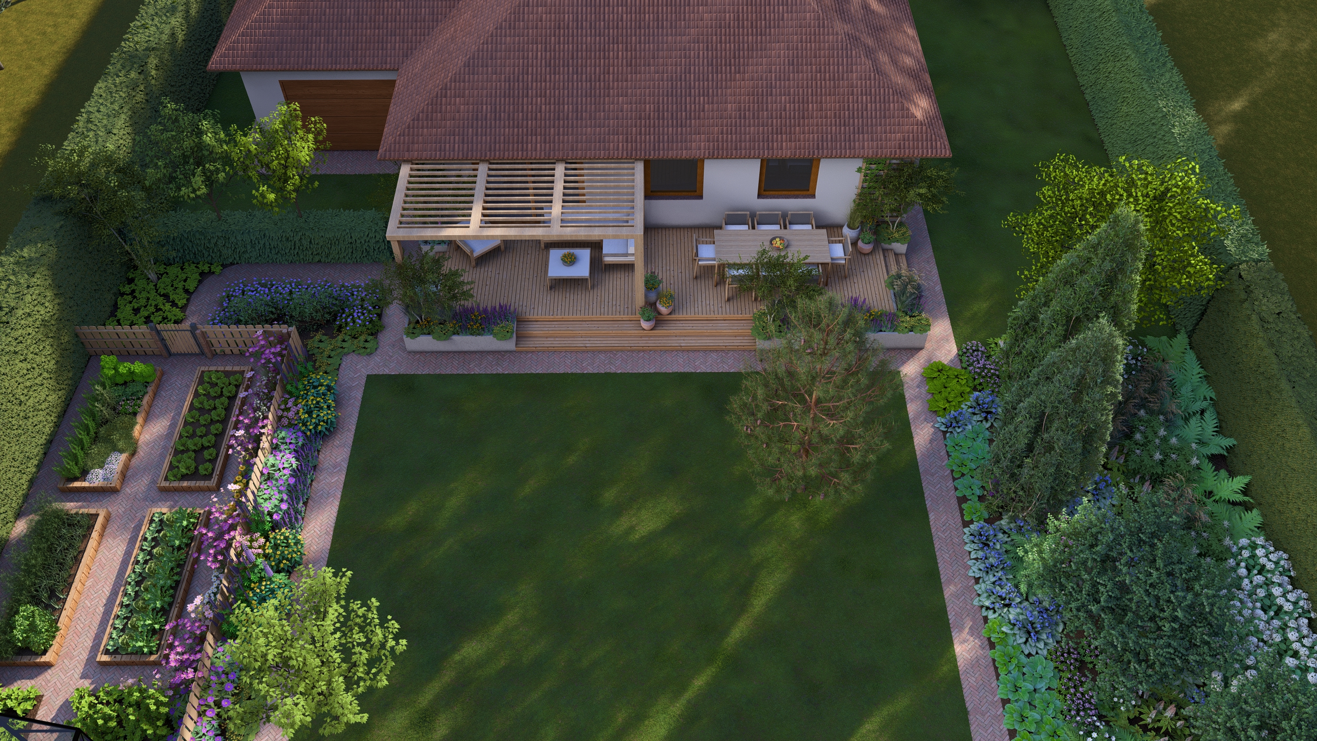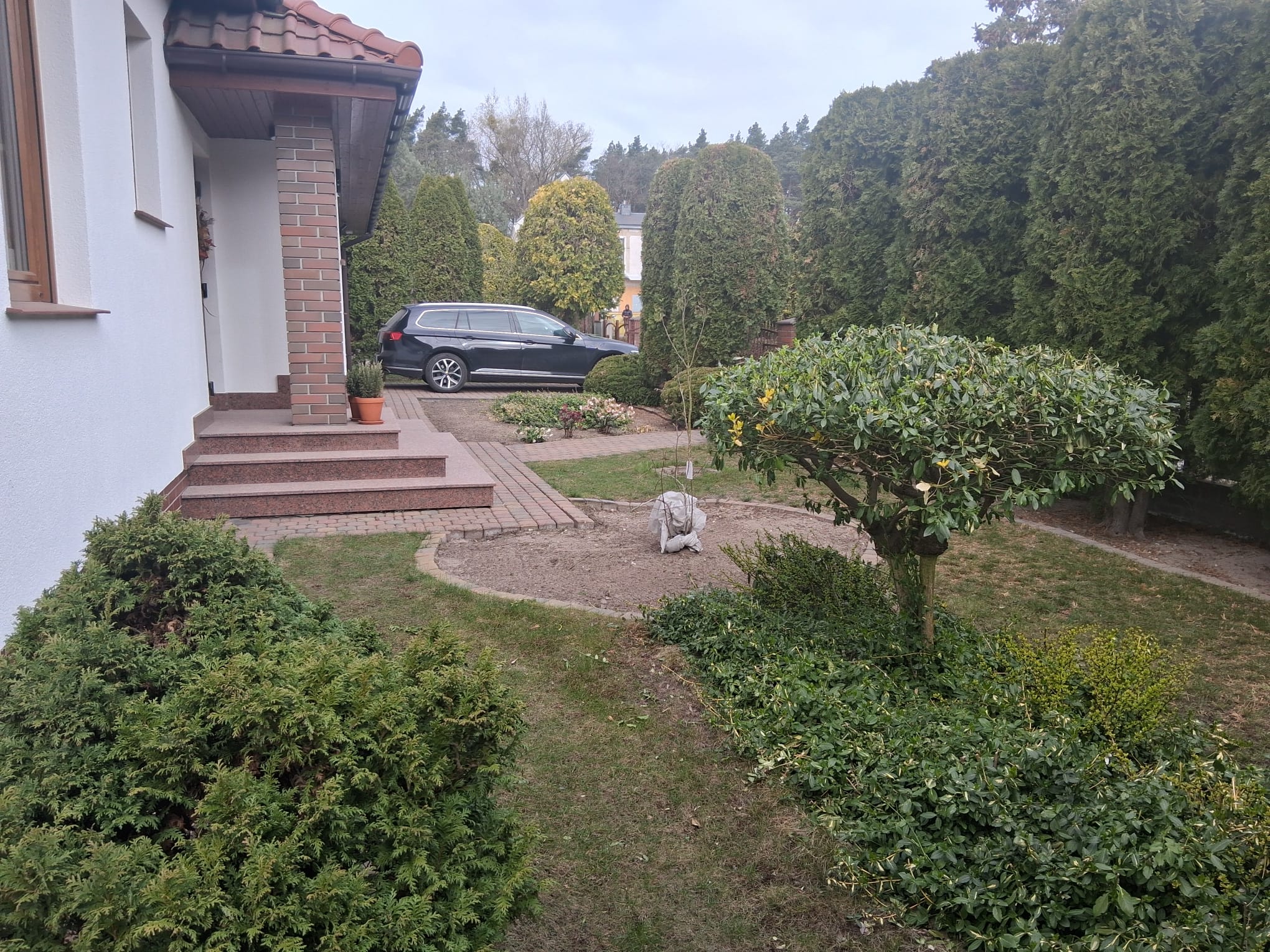 Moim zadaniem było tchnąć życie w ten ogród co dla mnie oznaczało przede wszystkim wprowadzenie drzew i krzewów liściastych, ale tez kwitnących bylin. Dzięki temu ogród zyskał zmienność w czasie, kolor, zapach i przytulność.