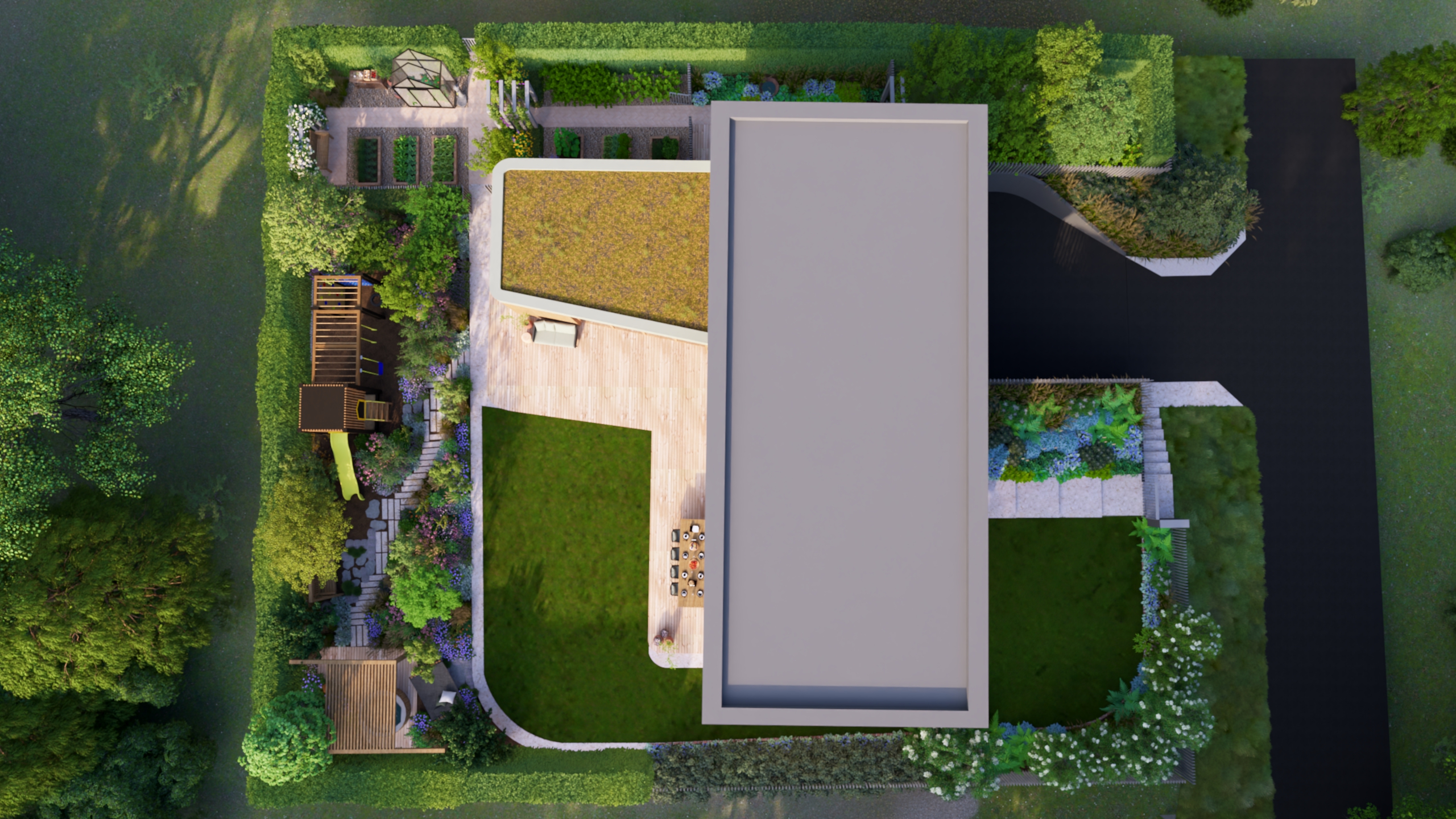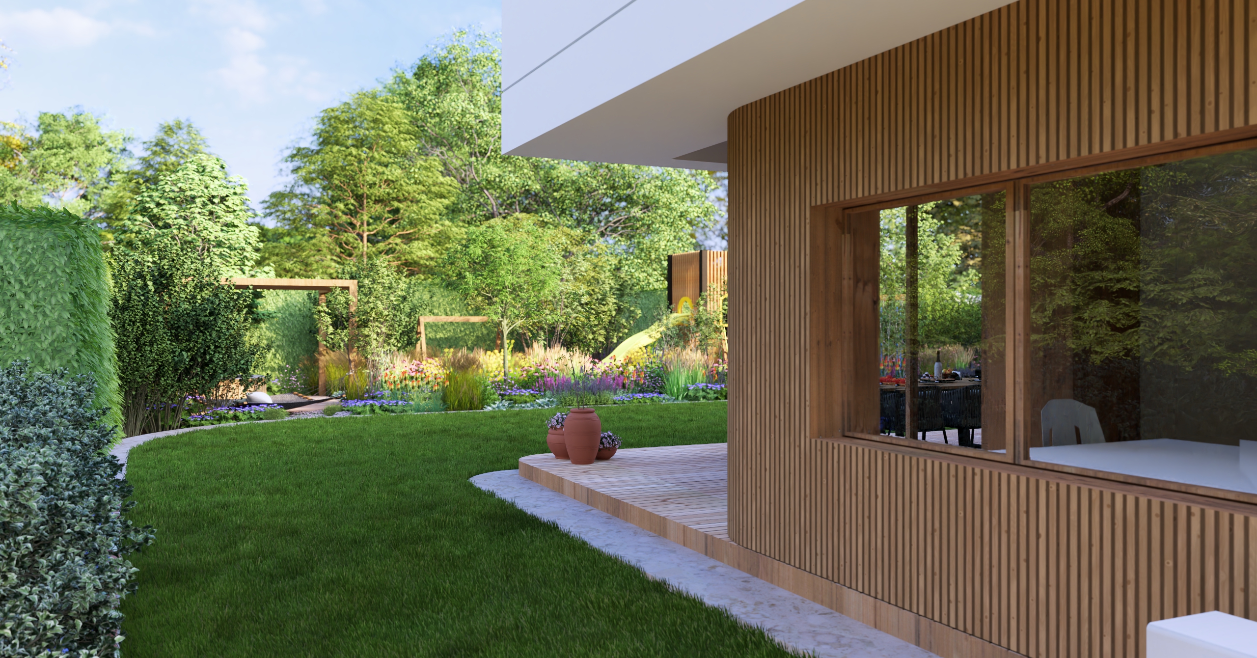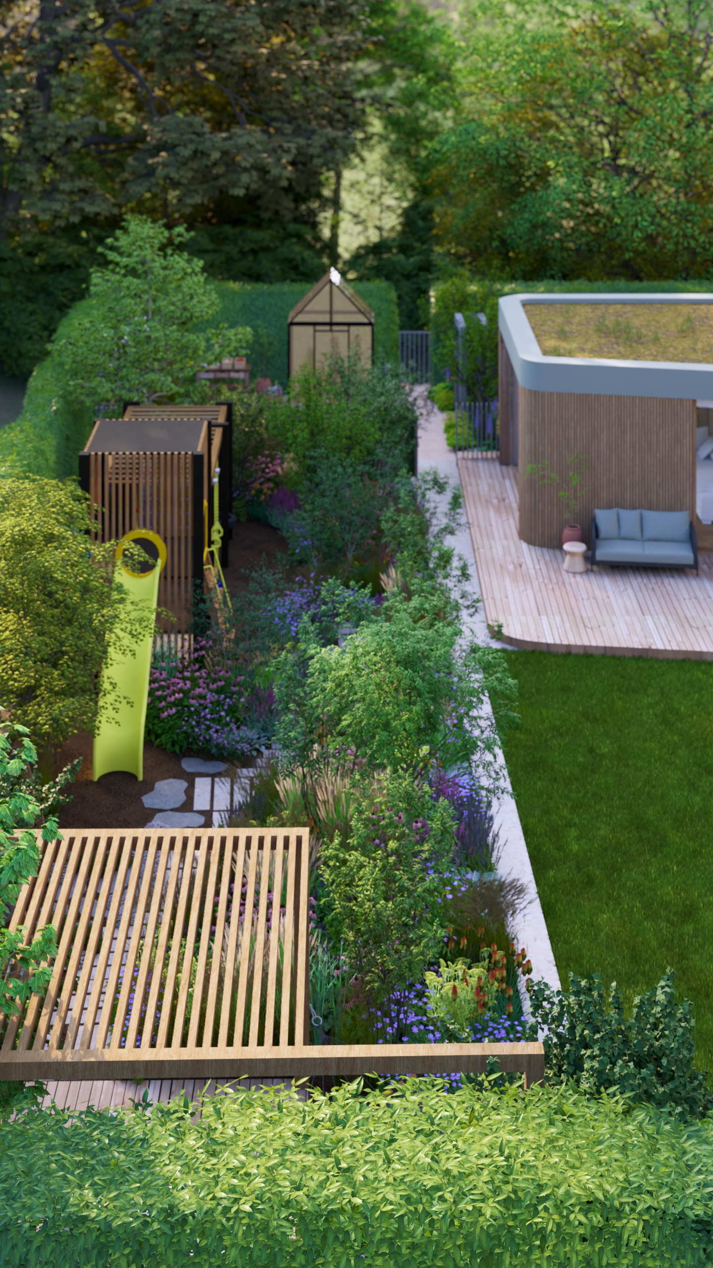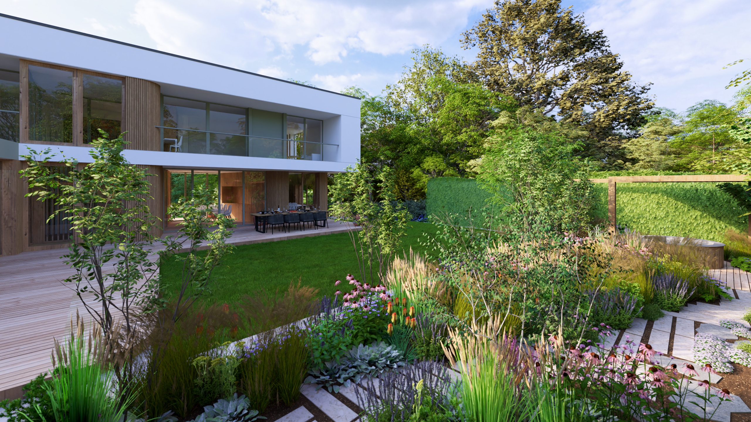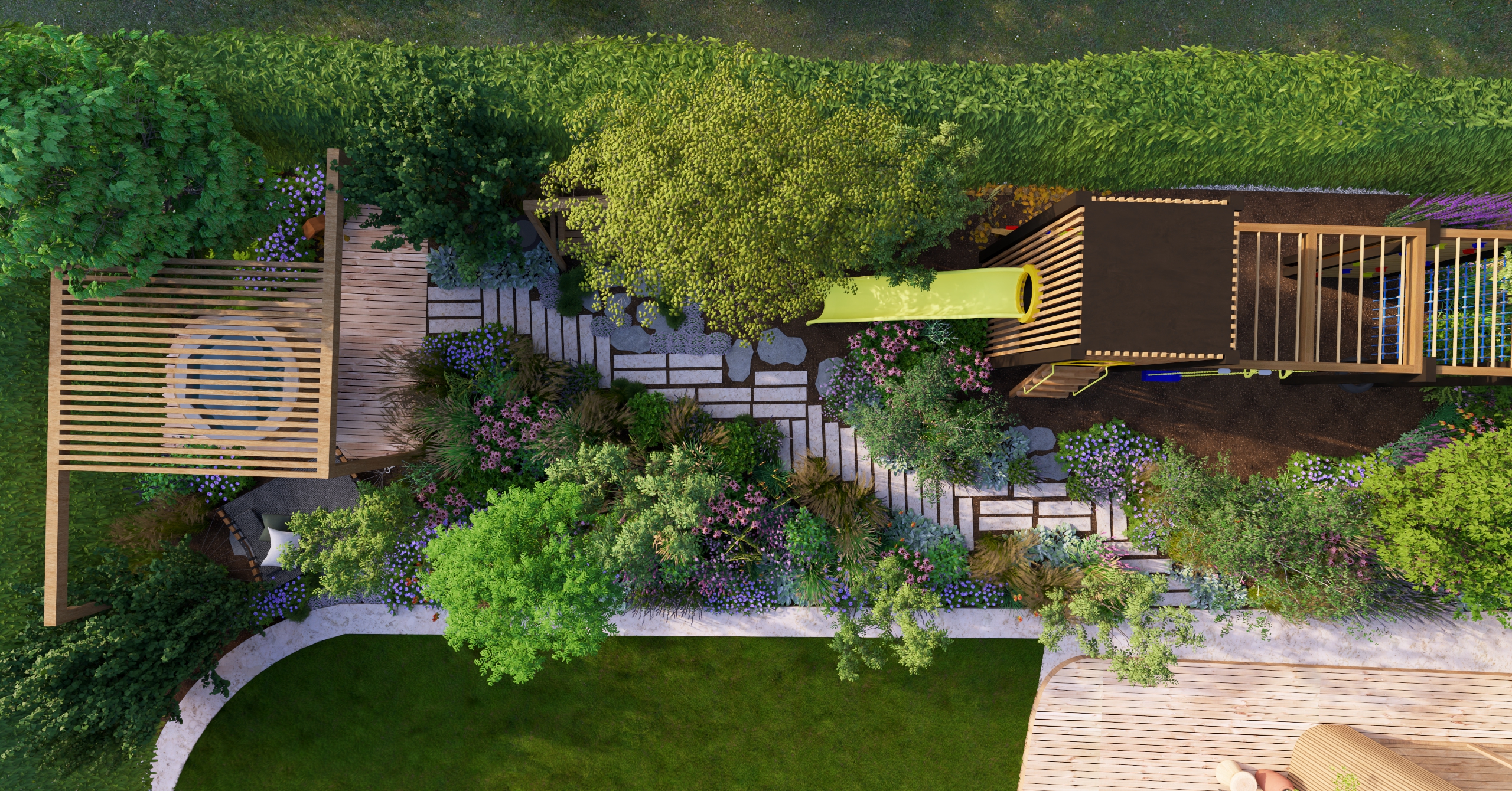 aby na małej działce stworzyć ogród dający możliwość życia w naturze. Te 3 rzeczy przyszło mi połączyć w tym projekcie.