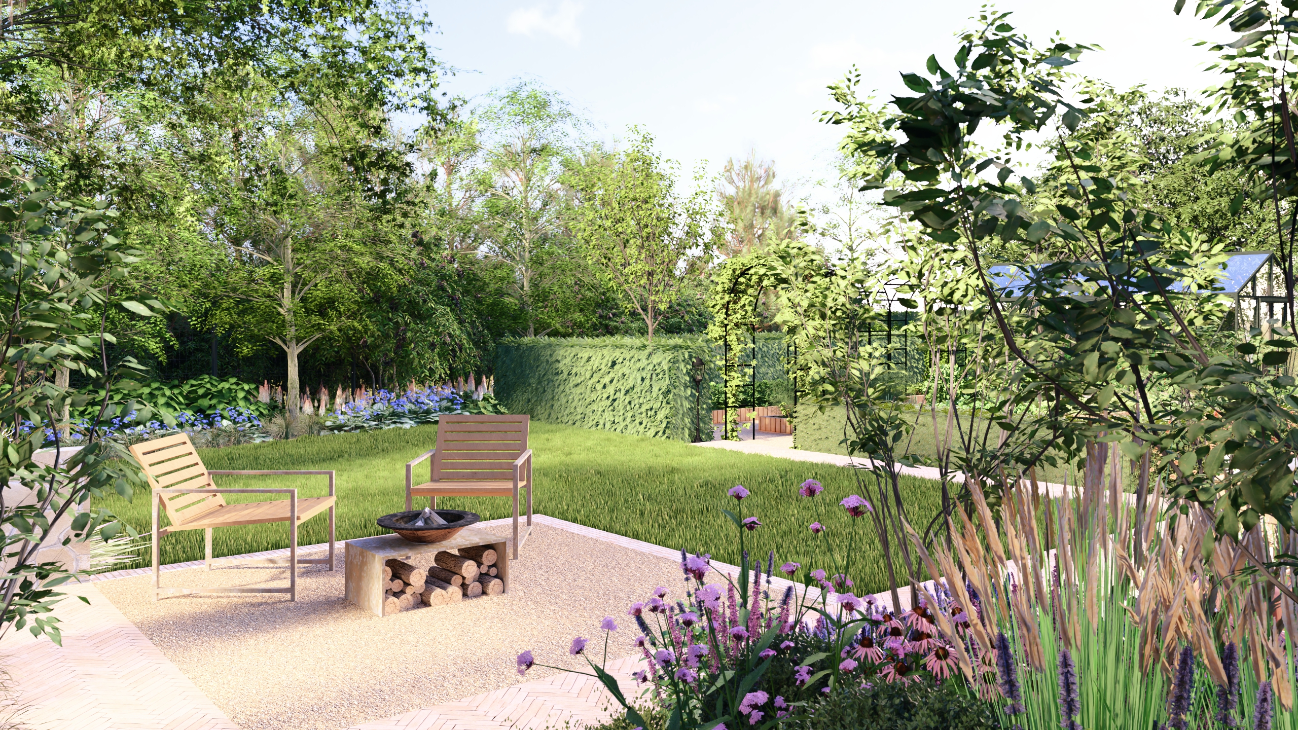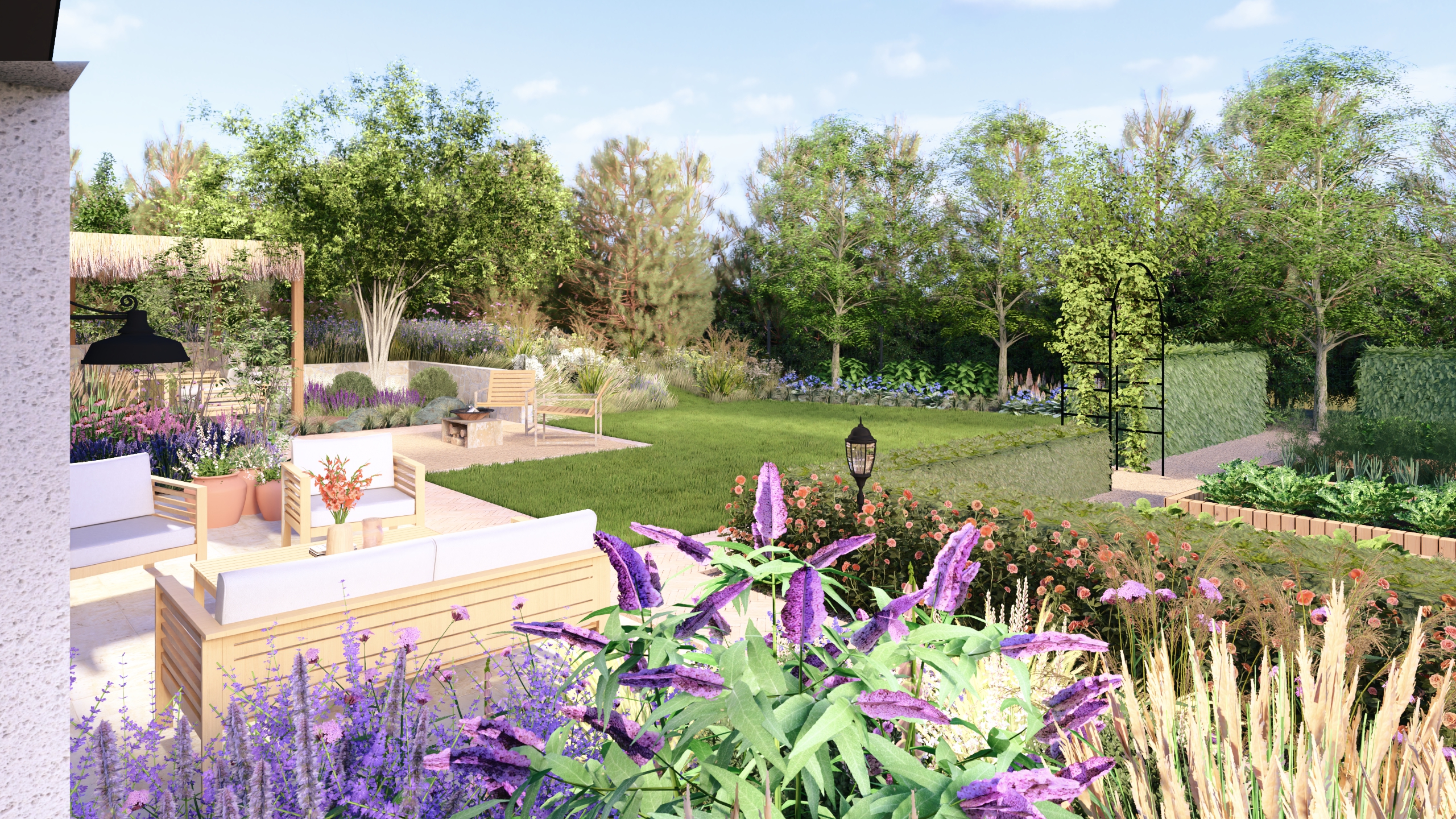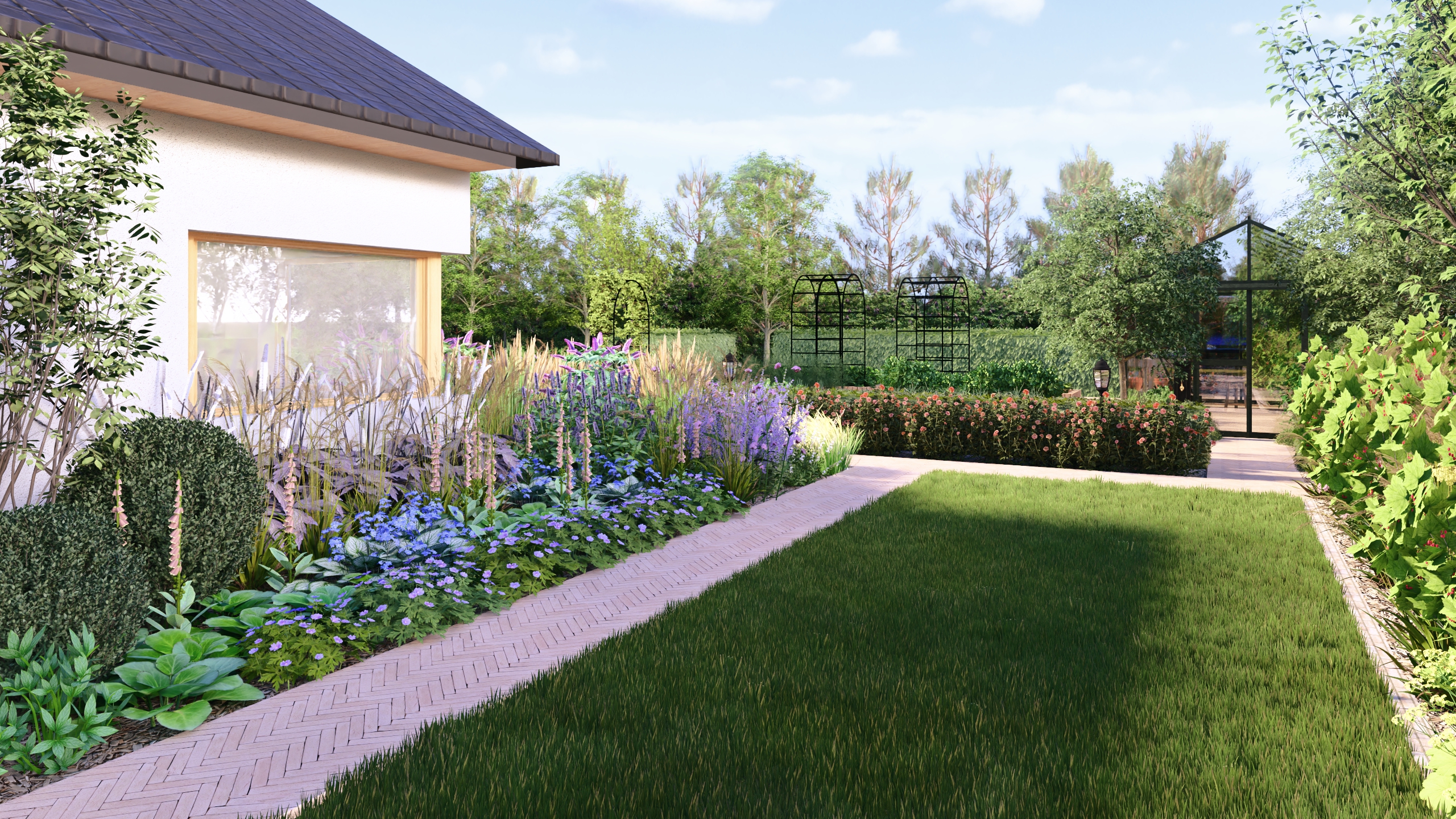 Ogród w Niepołomicach ma być miejscem do życia i kontaktu z naturą. Dlatego poza urządzonymi przestrzeniami, pozostawiliśmy tez miejsca dla dzikiej przyrody gdzie swobodnie będą mogły rozrastać się pokrzywy, polne kwiaty, a owady i drobne płazy znajda tam miejsce schronienia.