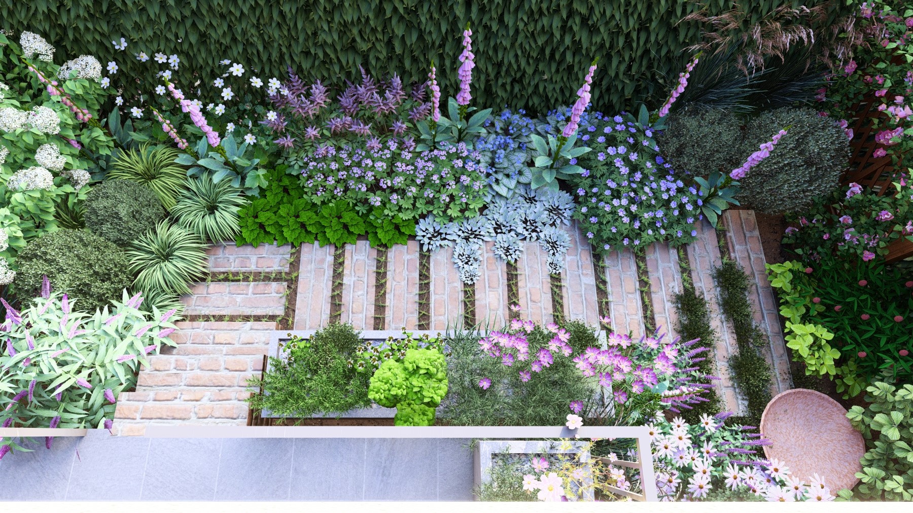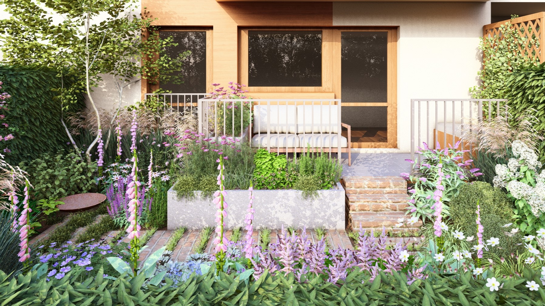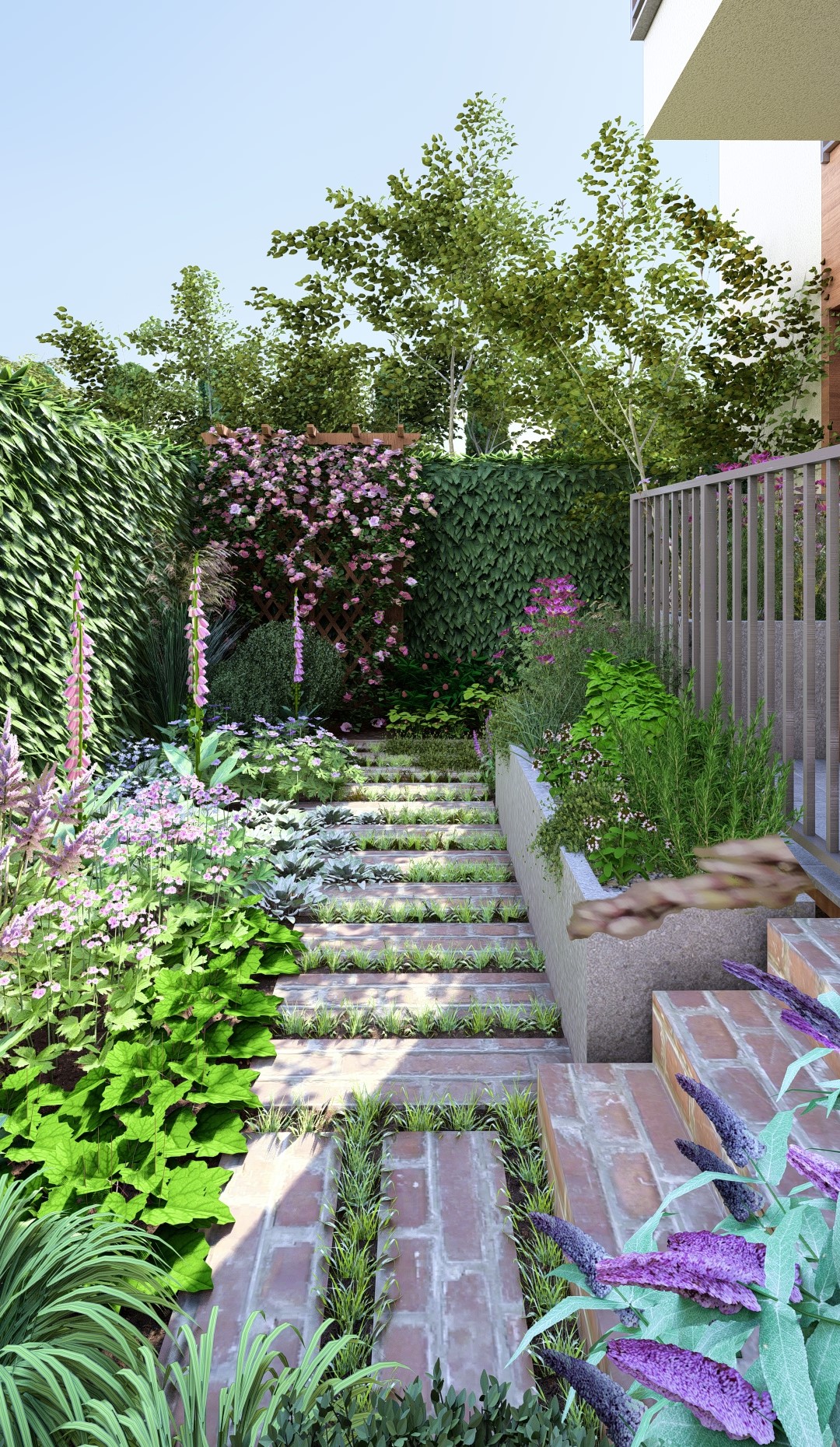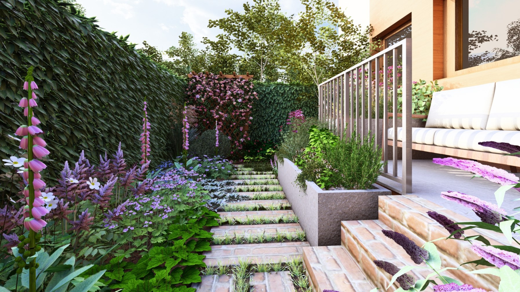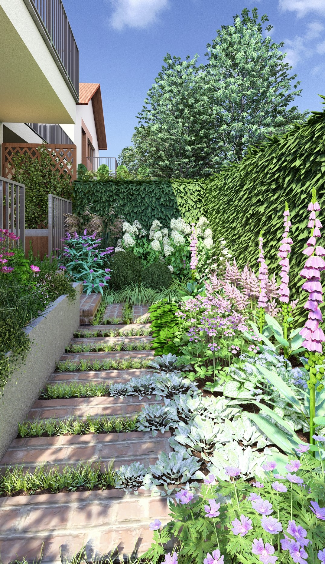 To były priorytety dla właścicielki tego ogródka. Stworzyłam więc przestrzeń bez trawnika, pełną bylin i kwitnących krzewów. Zapach był dla nas bardzo ważny więc wśród roślin kwitnących pojawiły się takie gatunki jak bez, wiciokrzew, floksy, róże i tytonie ozdobne.