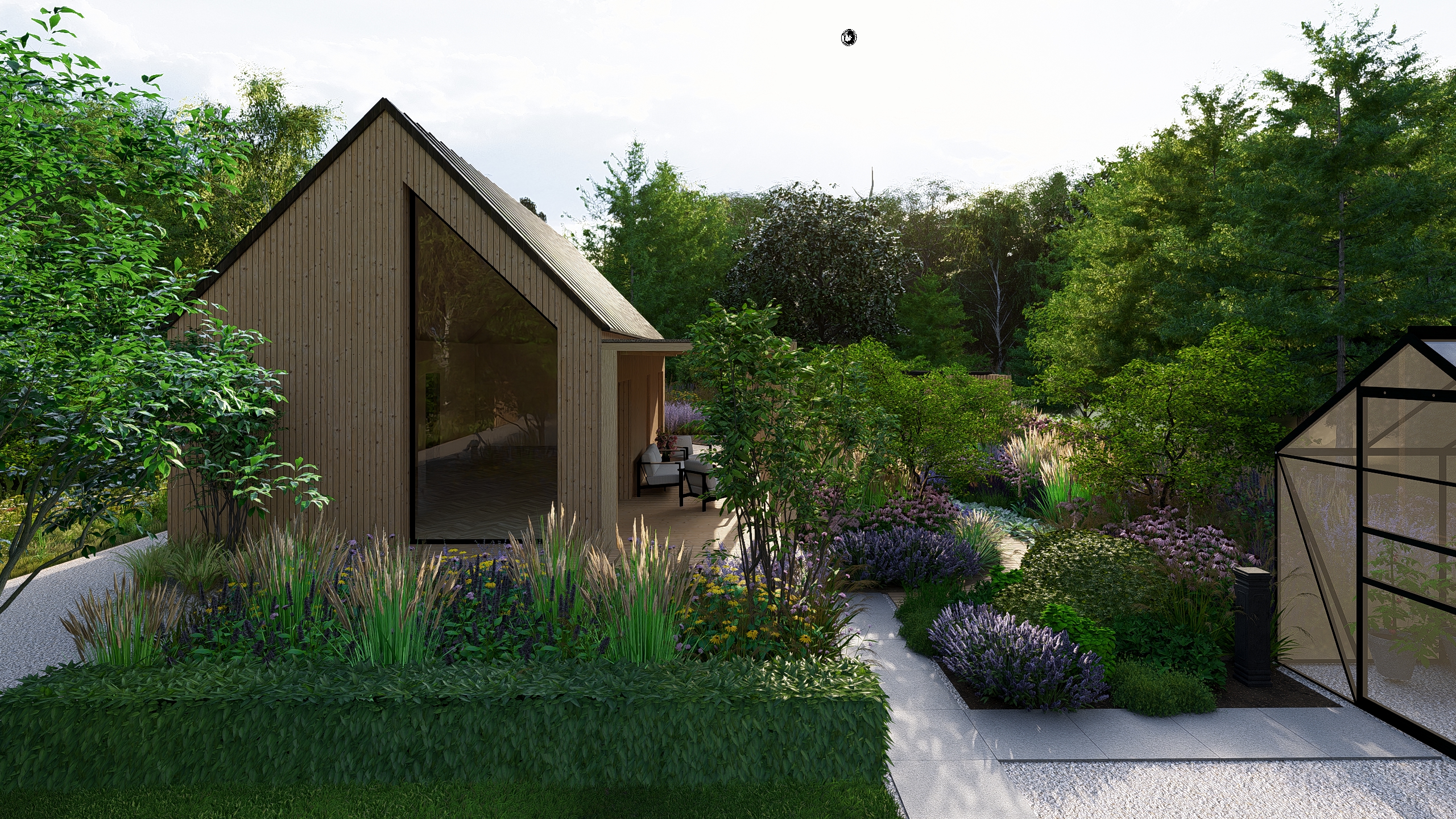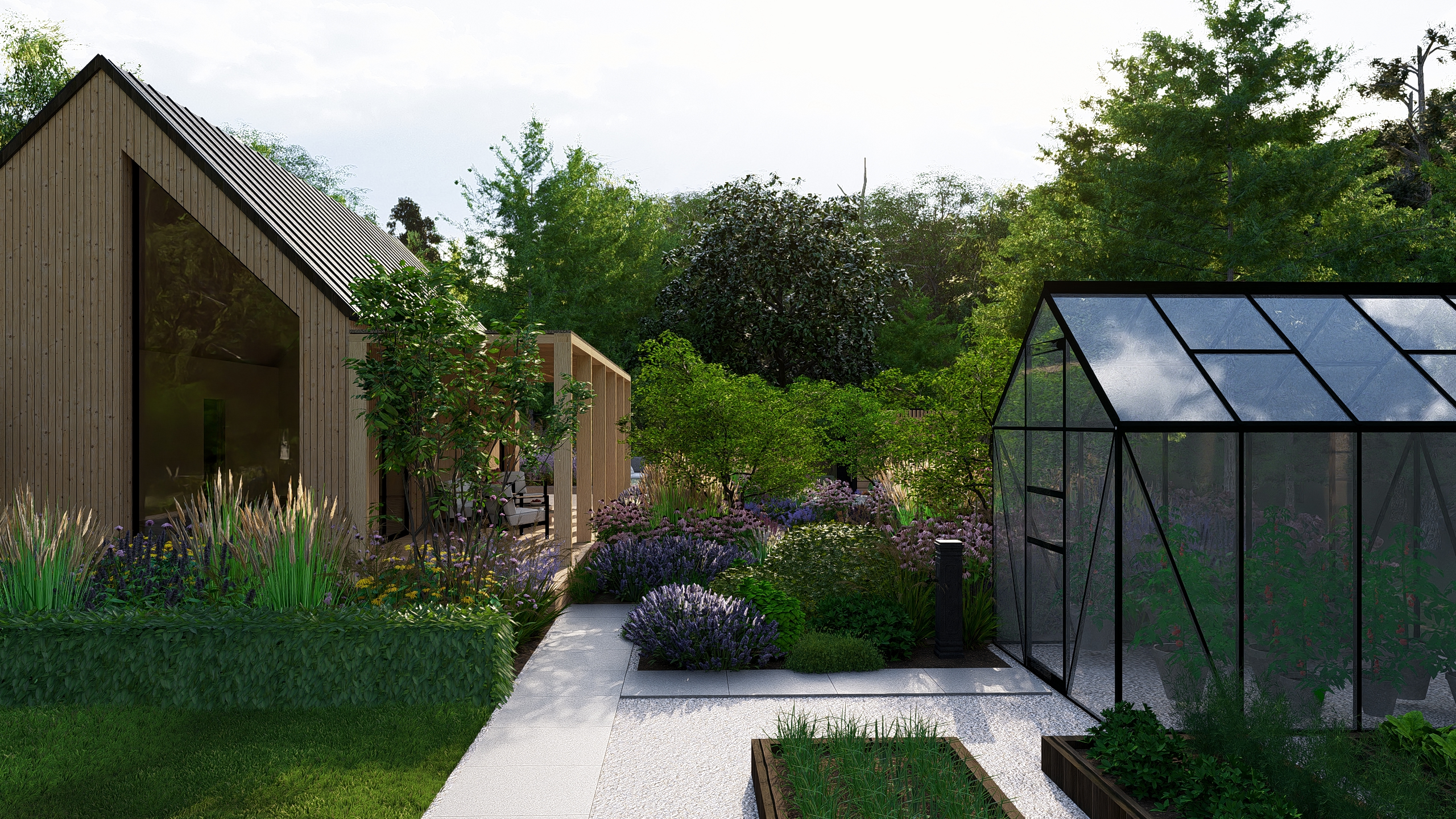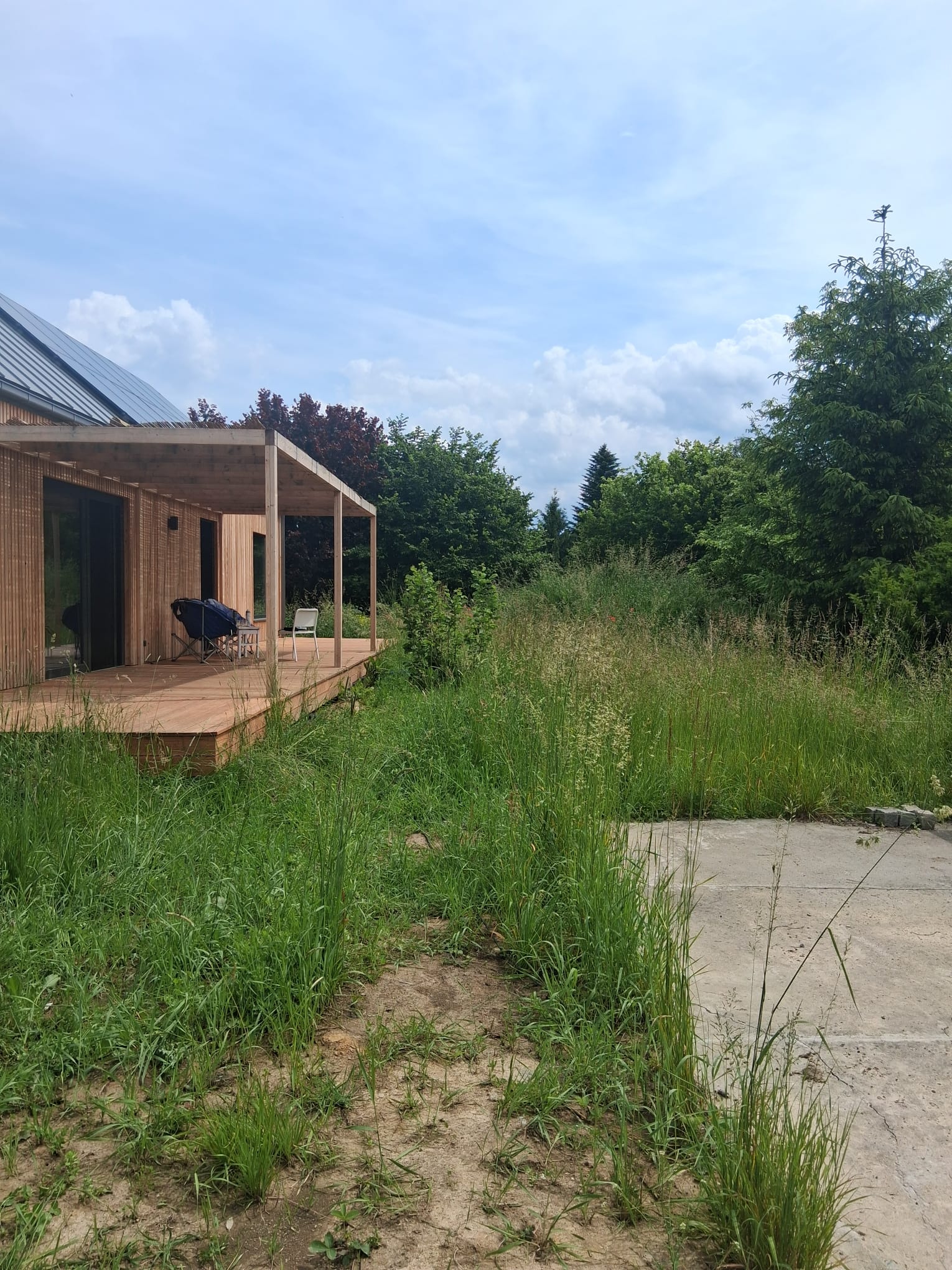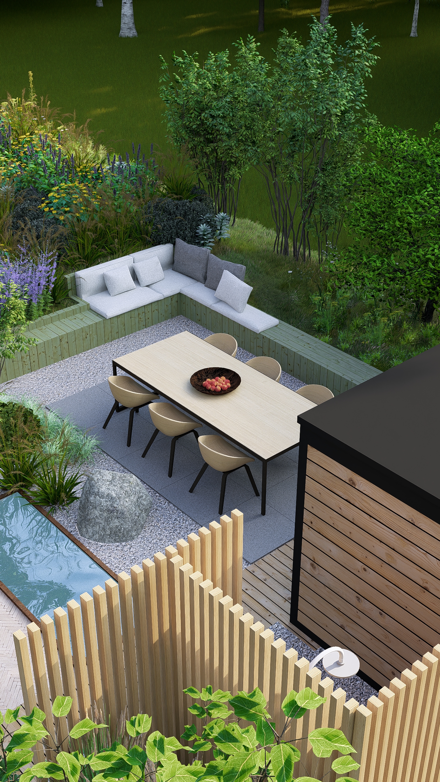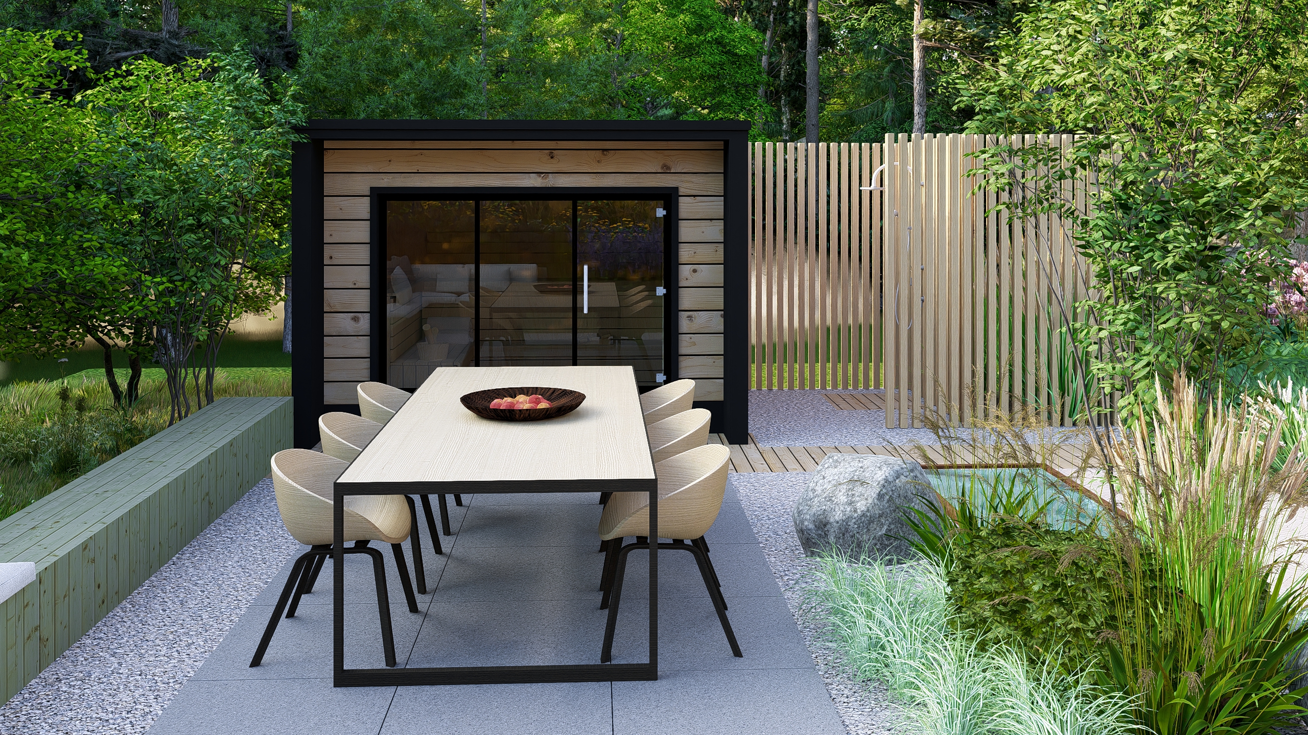 Inwestorzy chcieli stworzyć w ogrodzie miejsce do uprawy warzyw, ale też do rekreacji. Powstał więc cały kącik tzw. chill out z sauną, stołem jadalnianym i wygodnymi siedziskami do leniuchowania i czytania książek.