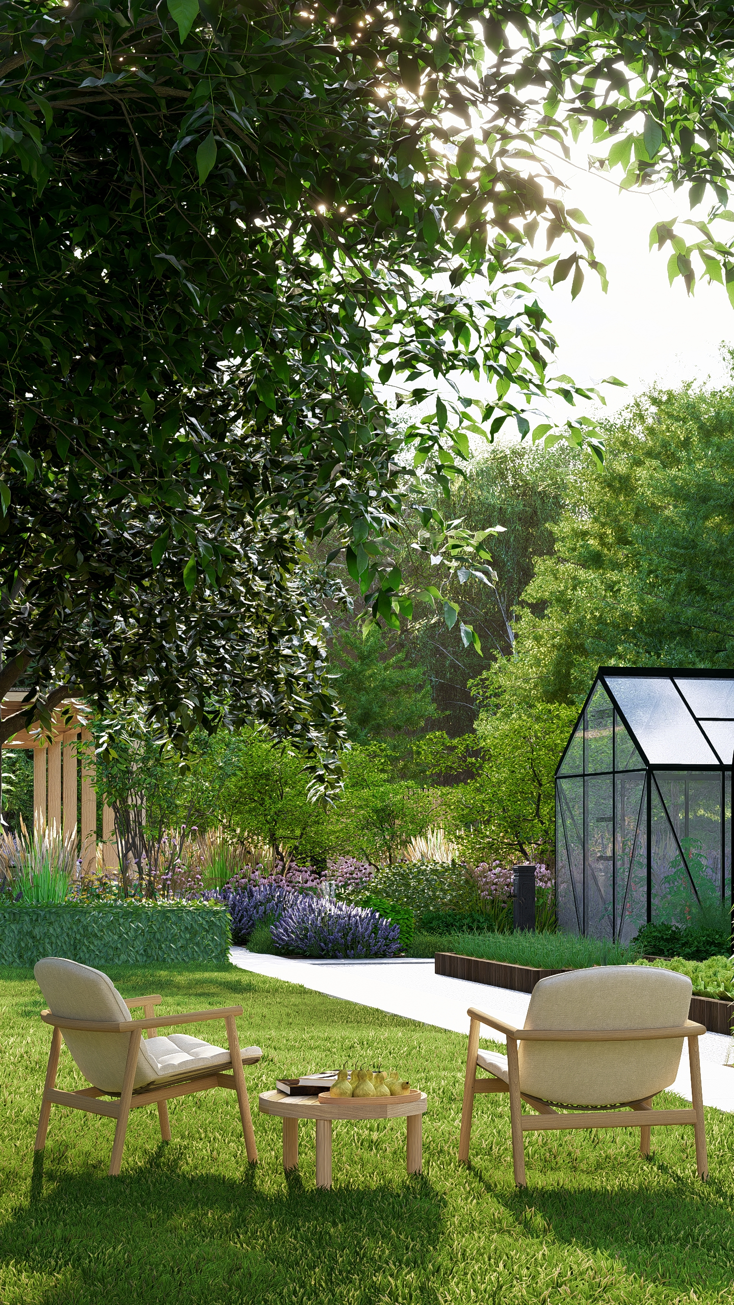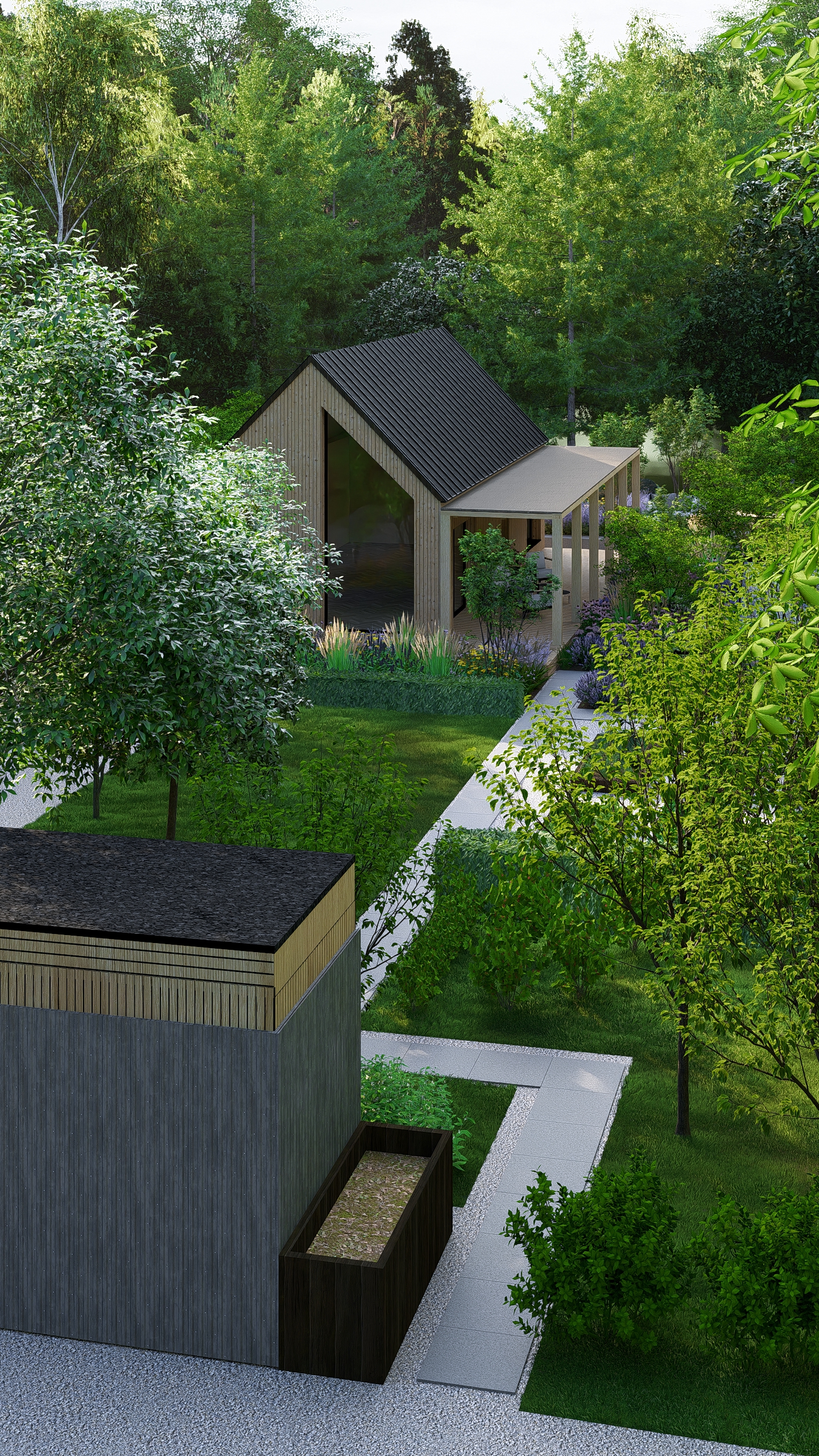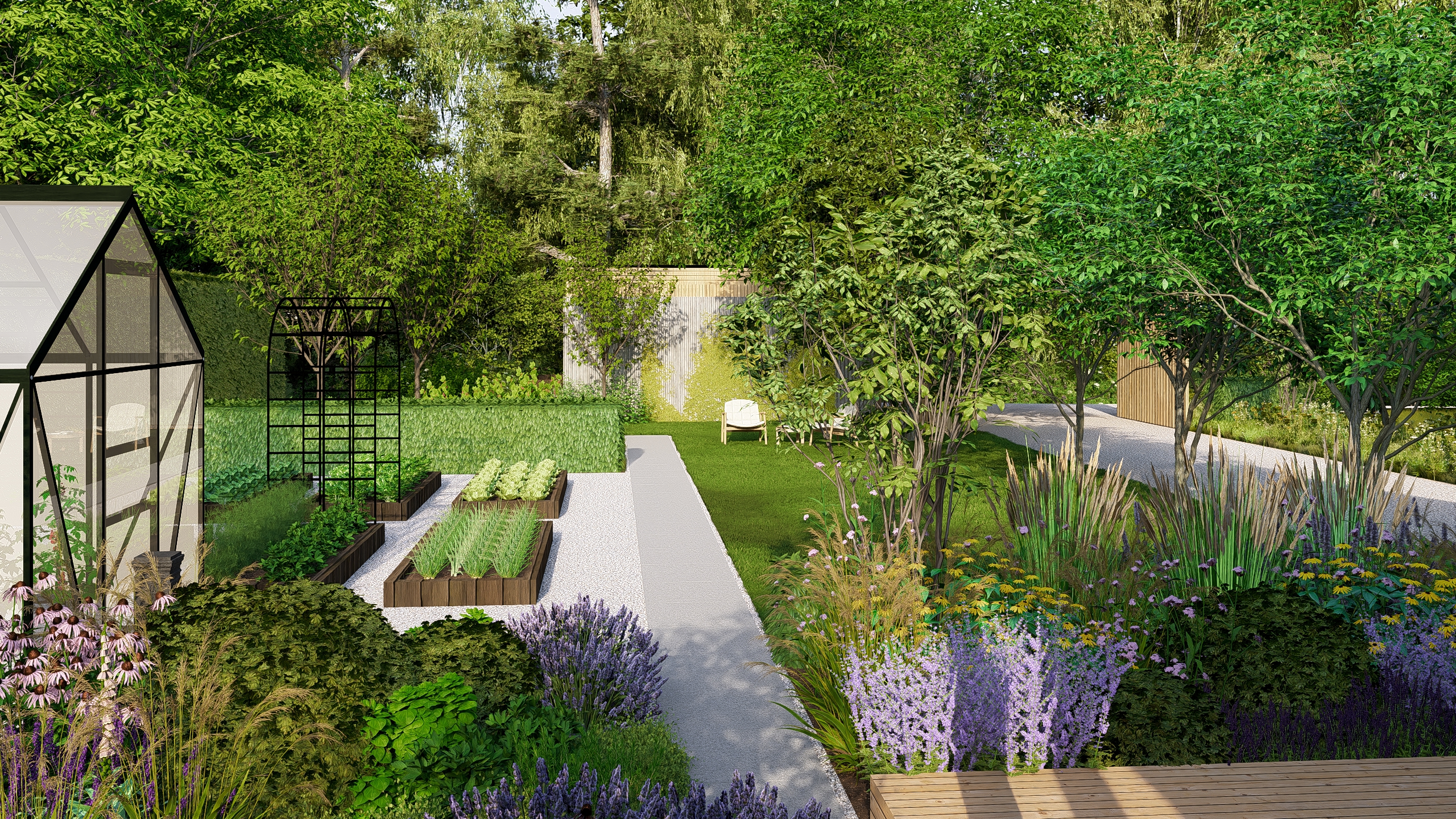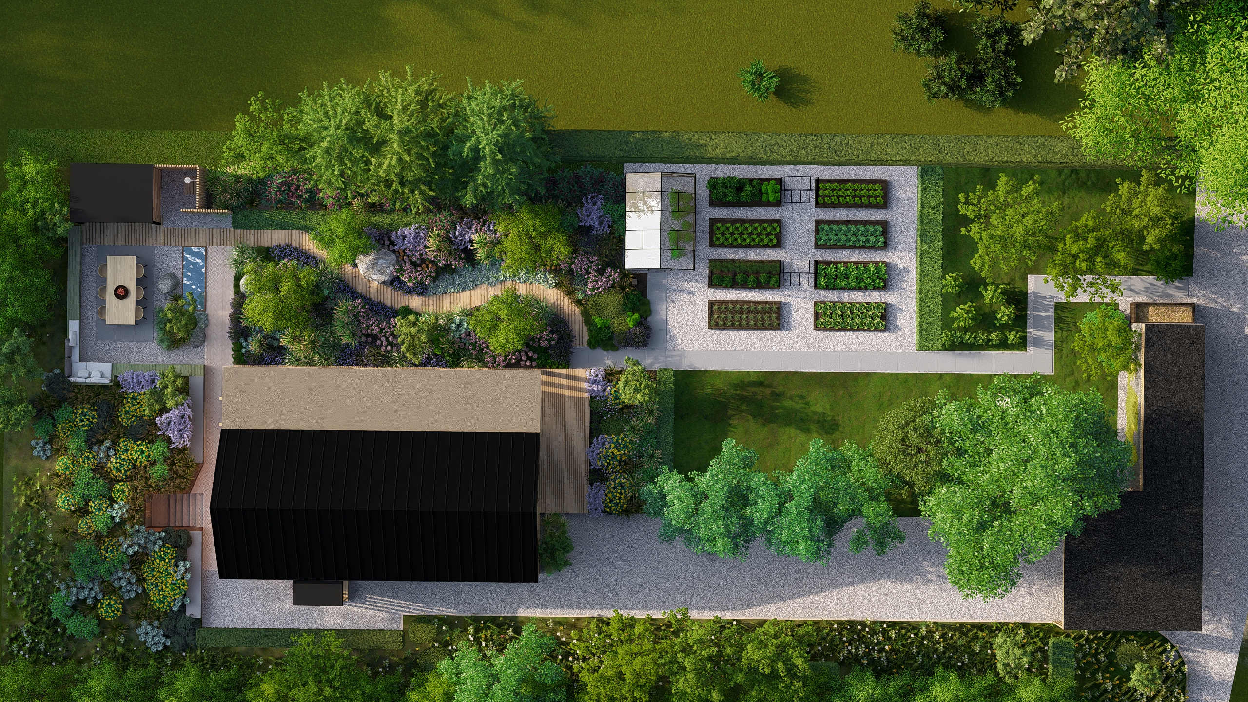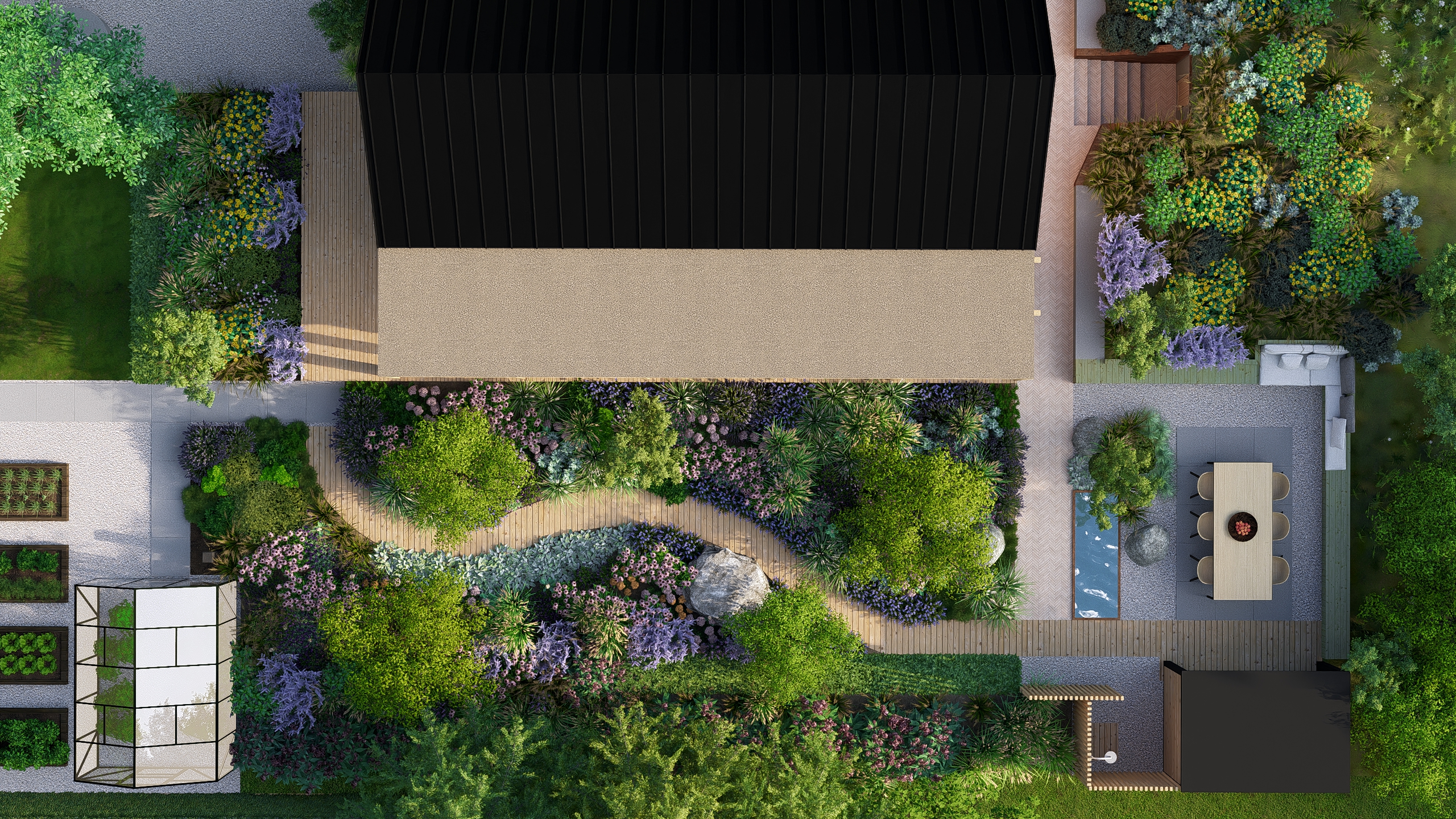 Inwestorzy chcieli stworzyć w ogrodzie miejsce do uprawy warzyw, ale też do rekreacji. Powstał więc cały kącik tzw. chill out z sauną, stołem jadalnianym i wygodnymi siedziskami do leniuchowania i czytania książek.