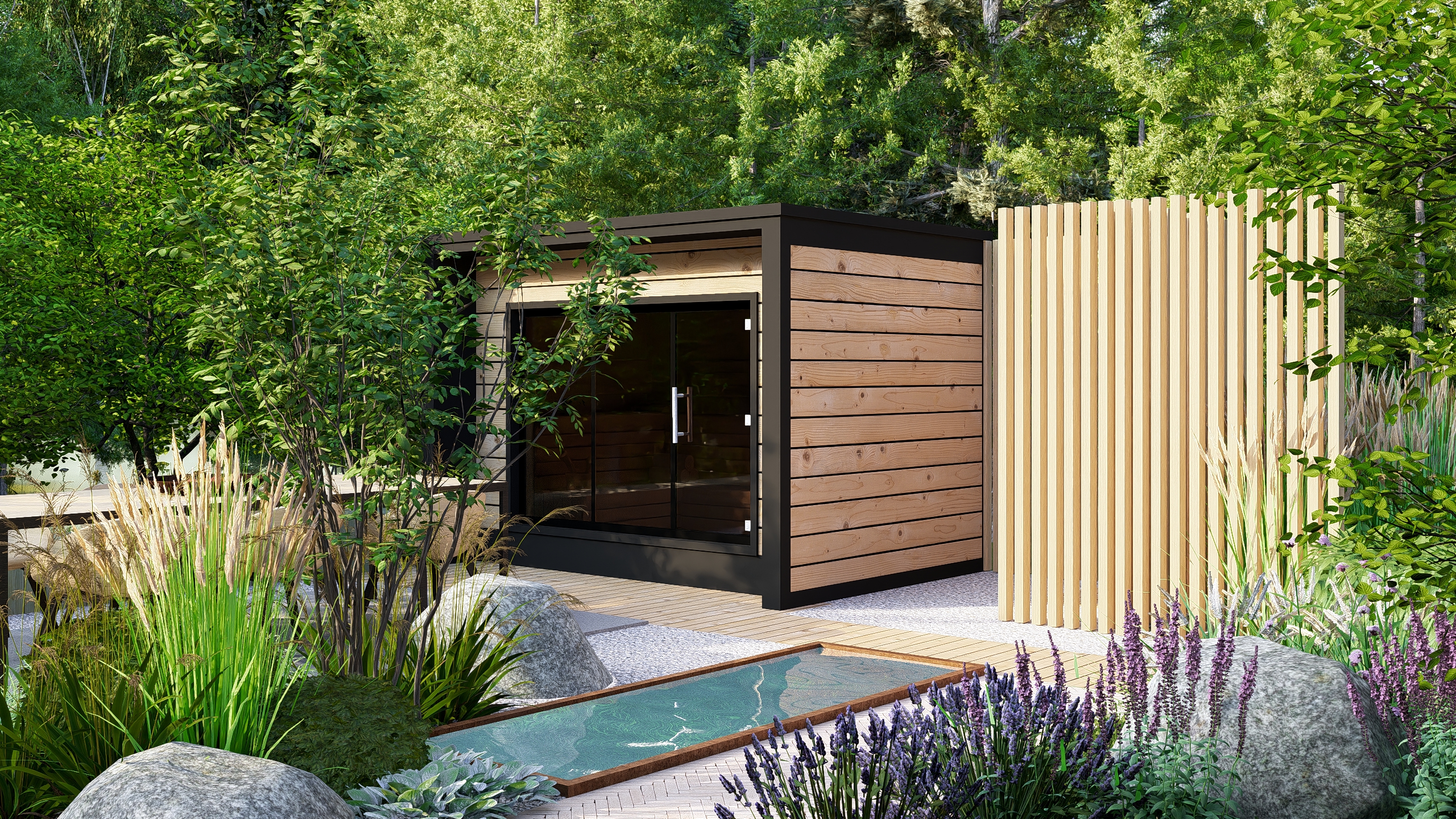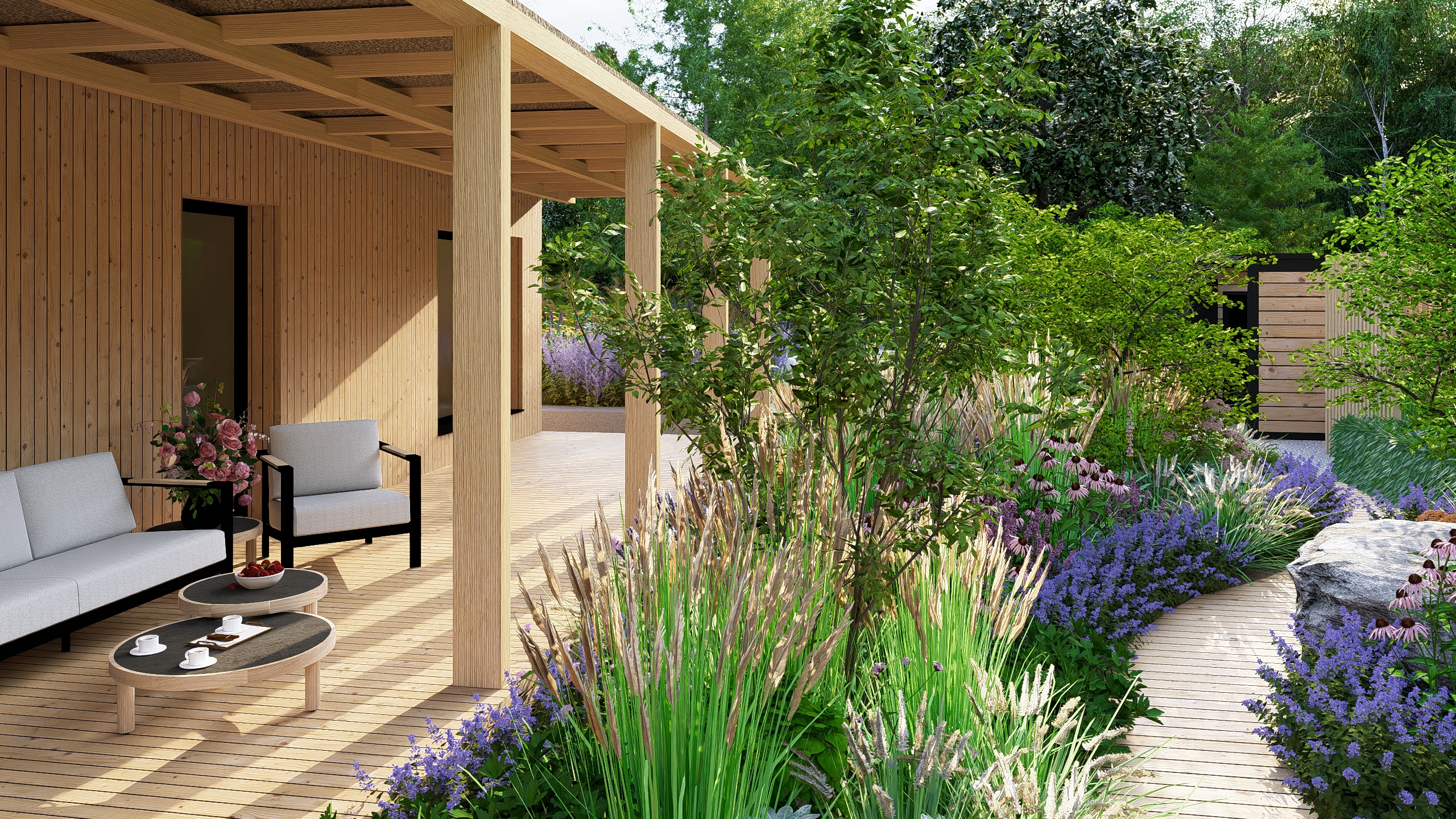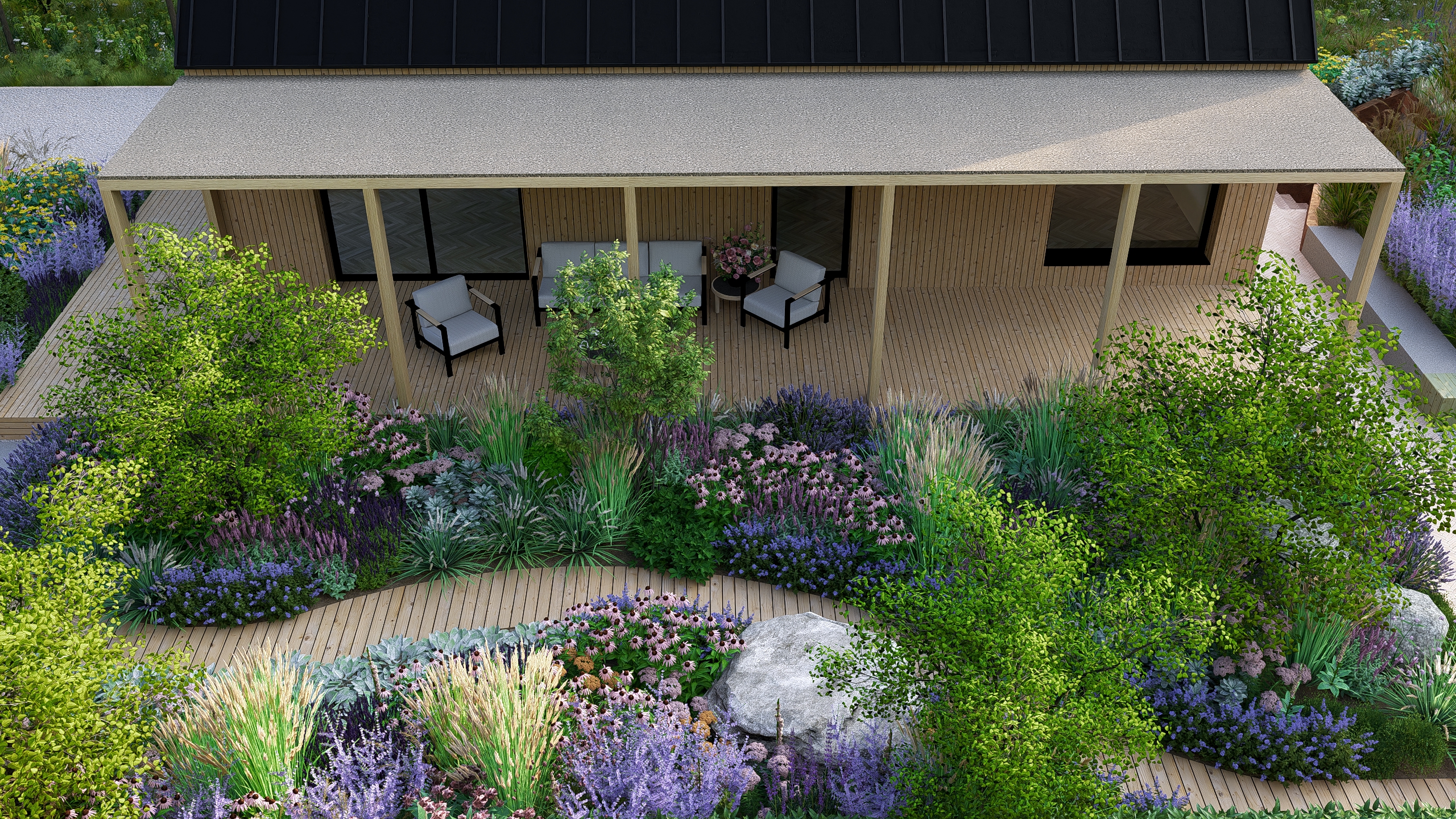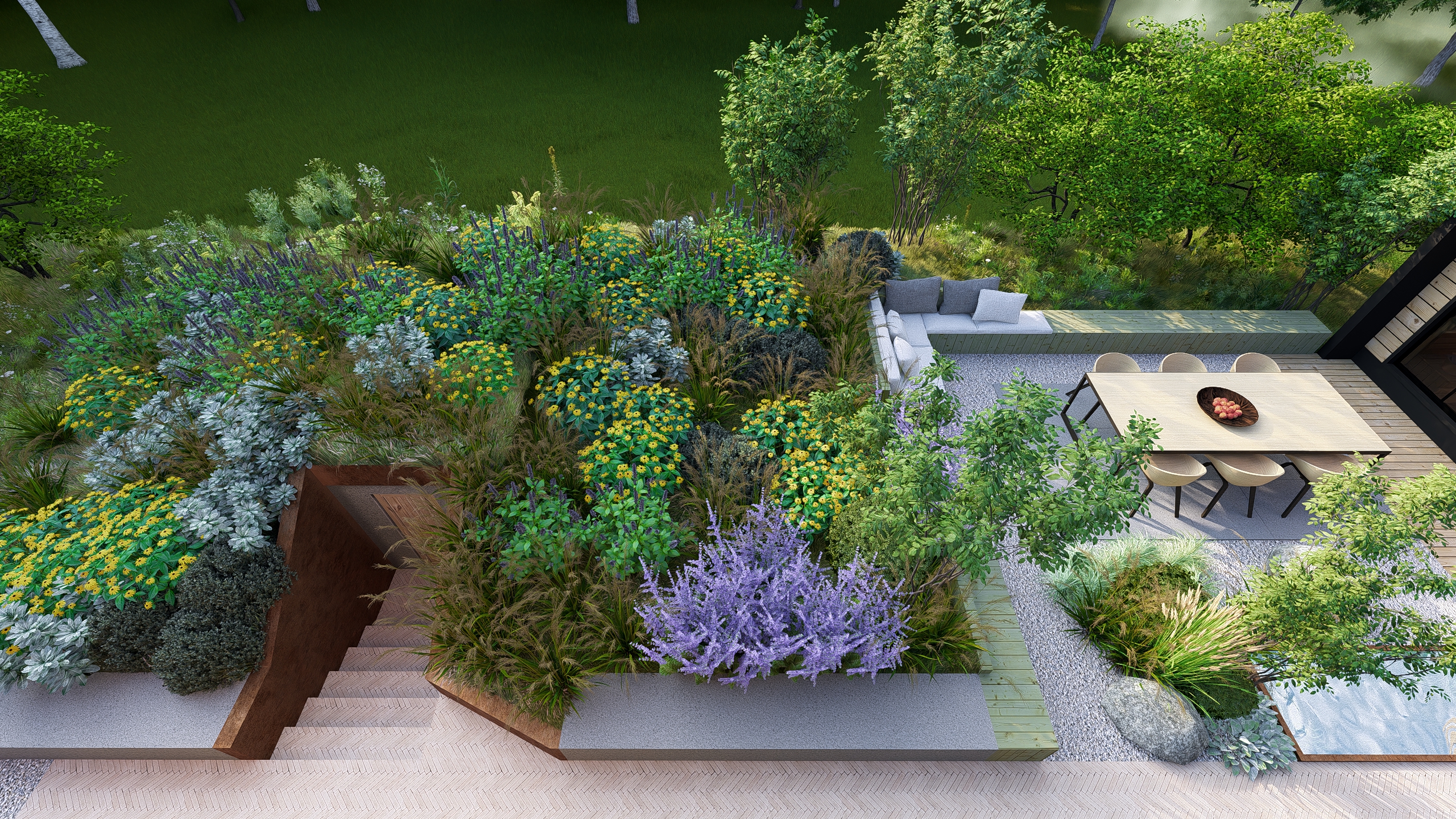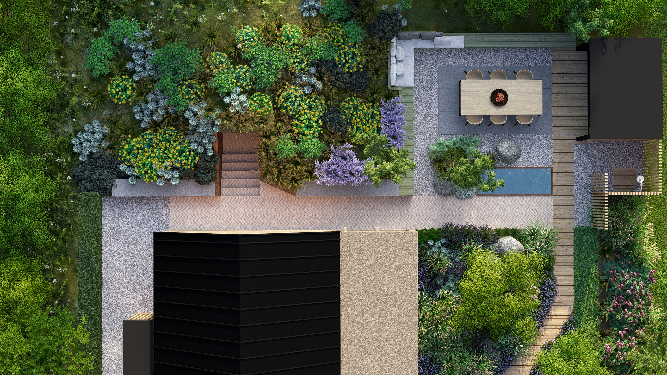 Inwestorzy chcieli stworzyć w ogrodzie miejsce do uprawy warzyw, ale też do rekreacji. Powstał więc cały kącik tzw. chill out z sauną, stołem jadalnianym i wygodnymi siedziskami do leniuchowania i czytania książek.