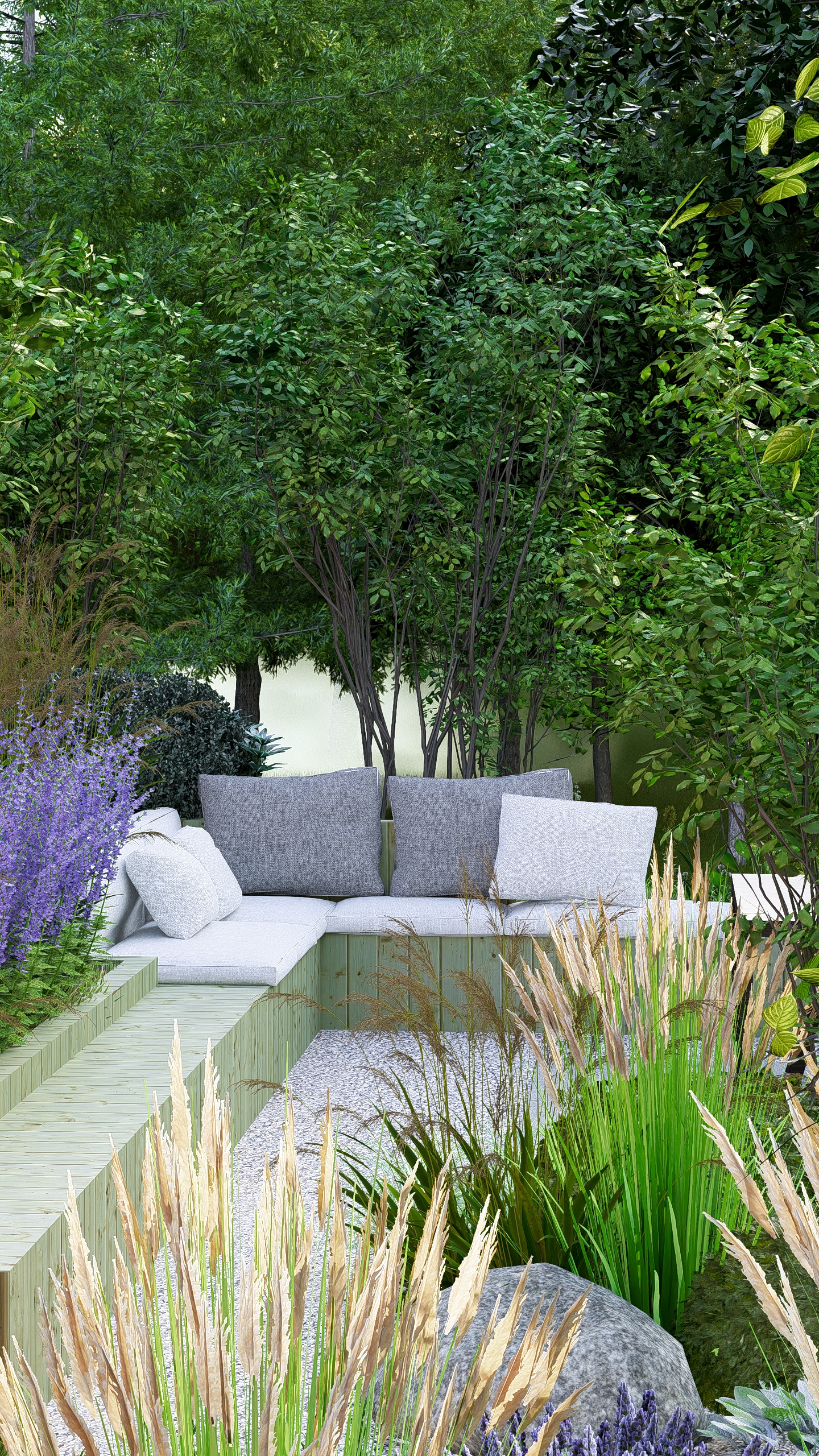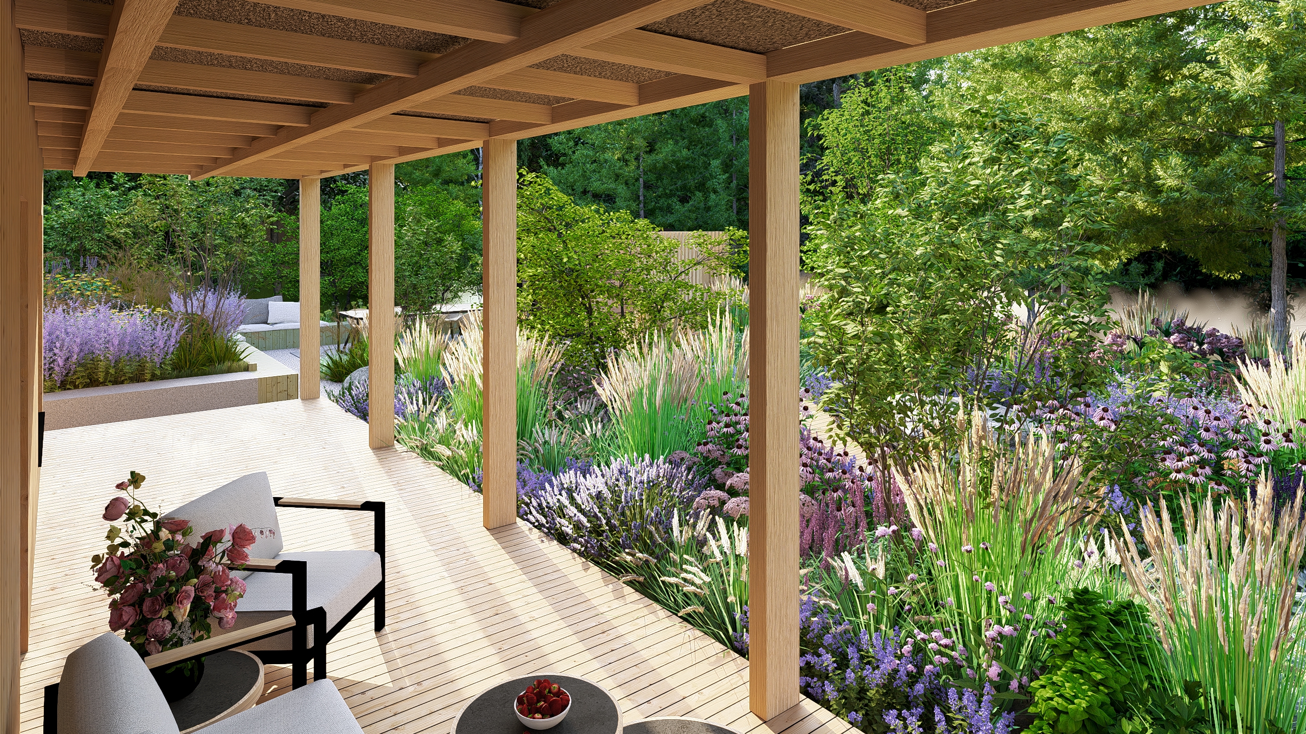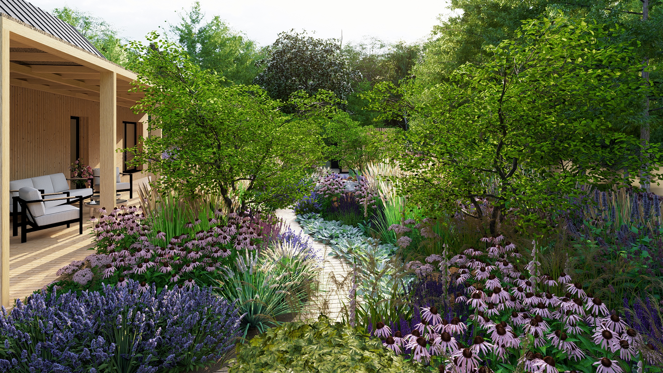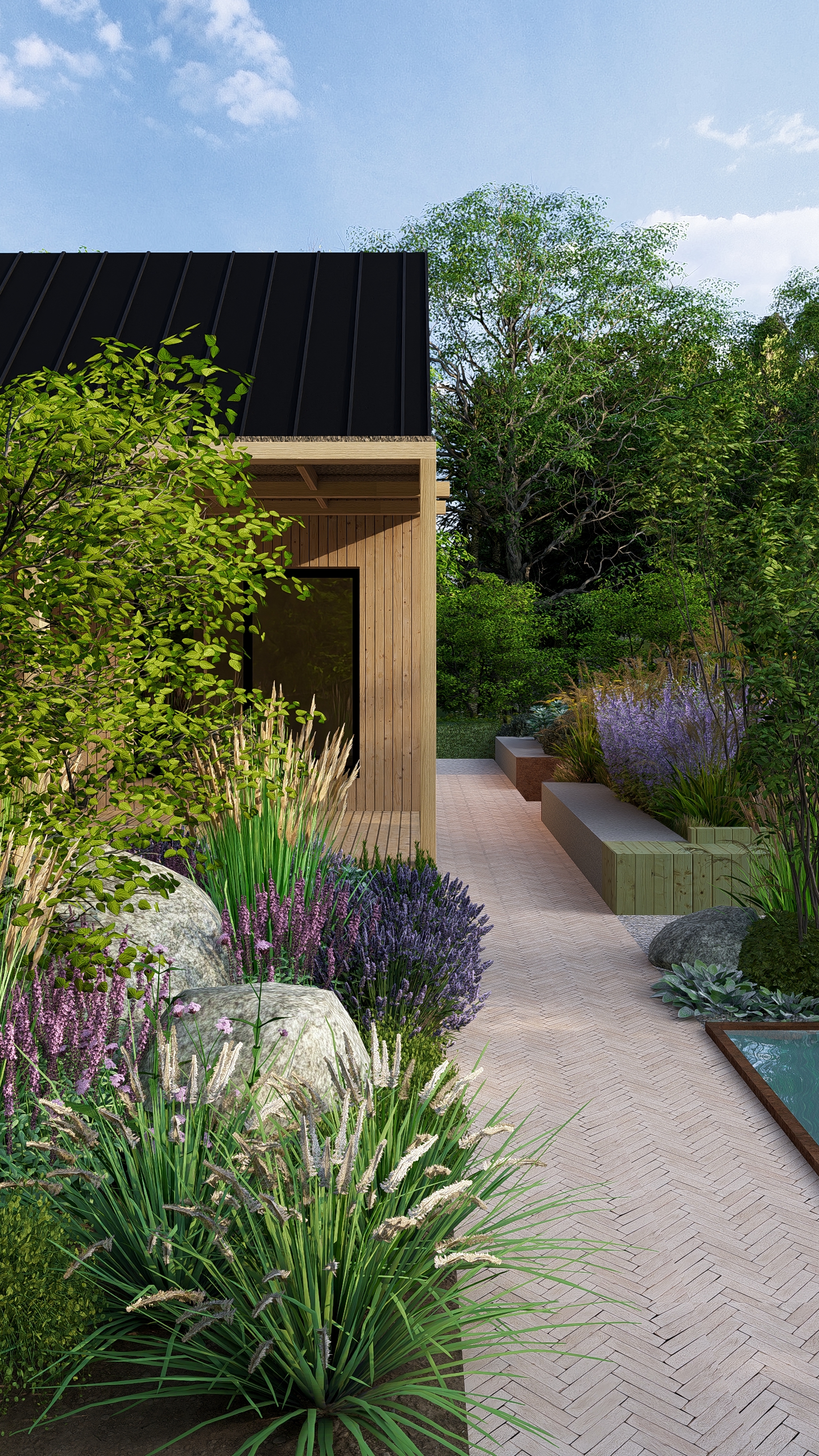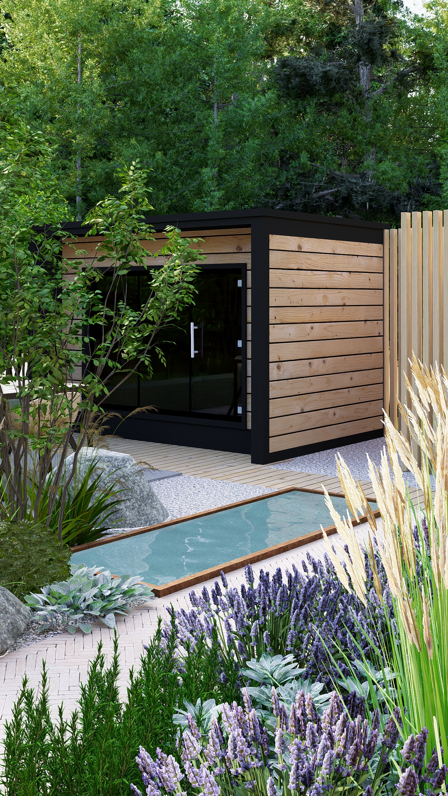 Inwestorzy chcieli stworzyć w ogrodzie miejsce do uprawy warzyw, ale też do rekreacji. Powstał więc cały kącik tzw. chill out z sauną, stołem jadalnianym i wygodnymi siedziskami do leniuchowania i czytania książek.