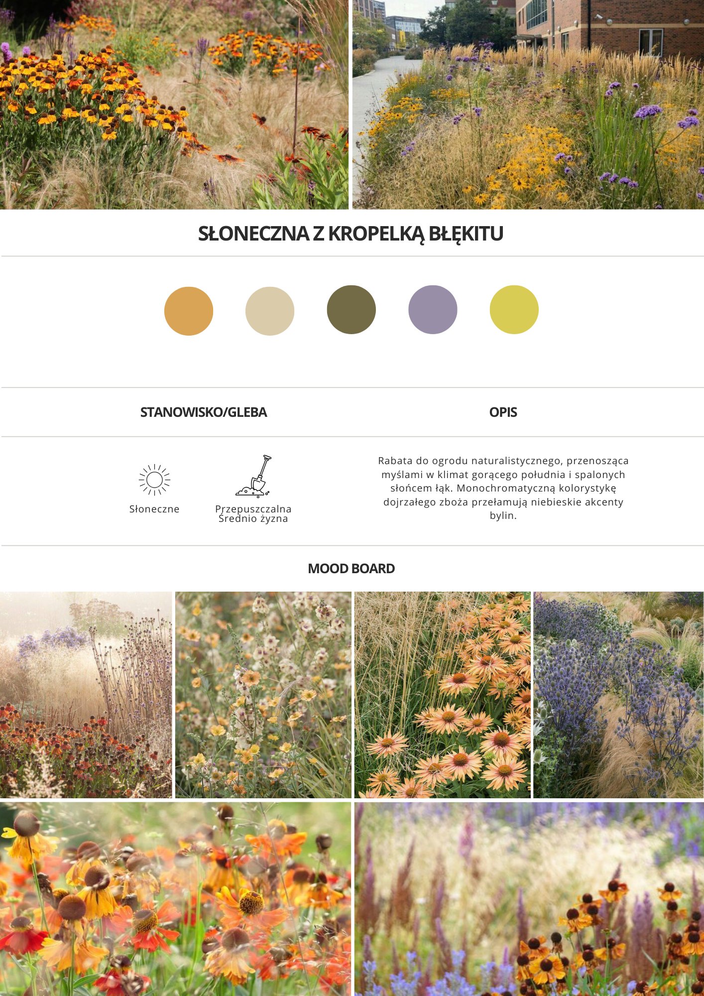 Ta rabata przenosi na południe. Zastosowanie dużej ilości traw ozdobnych i bylin o żółtych kwiatach daje efekt spalonej słońcem łąki, a subtelny dodatek koloru niebieskiego dopełnia paletę barw. Sprawdzi się w miejscach słonecznych w ogrodach w stylu naturalistycznym.