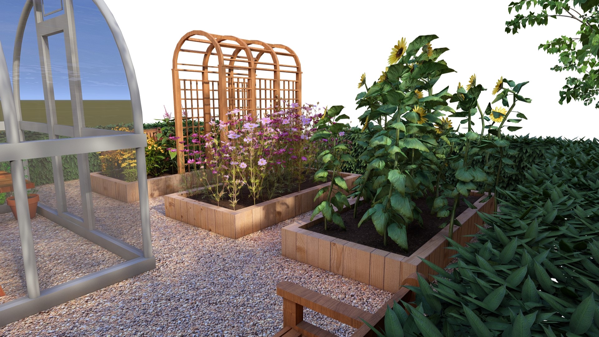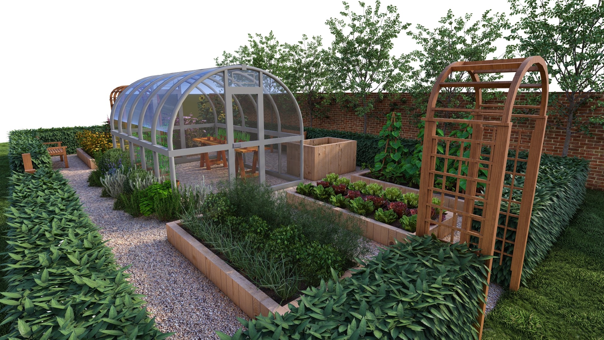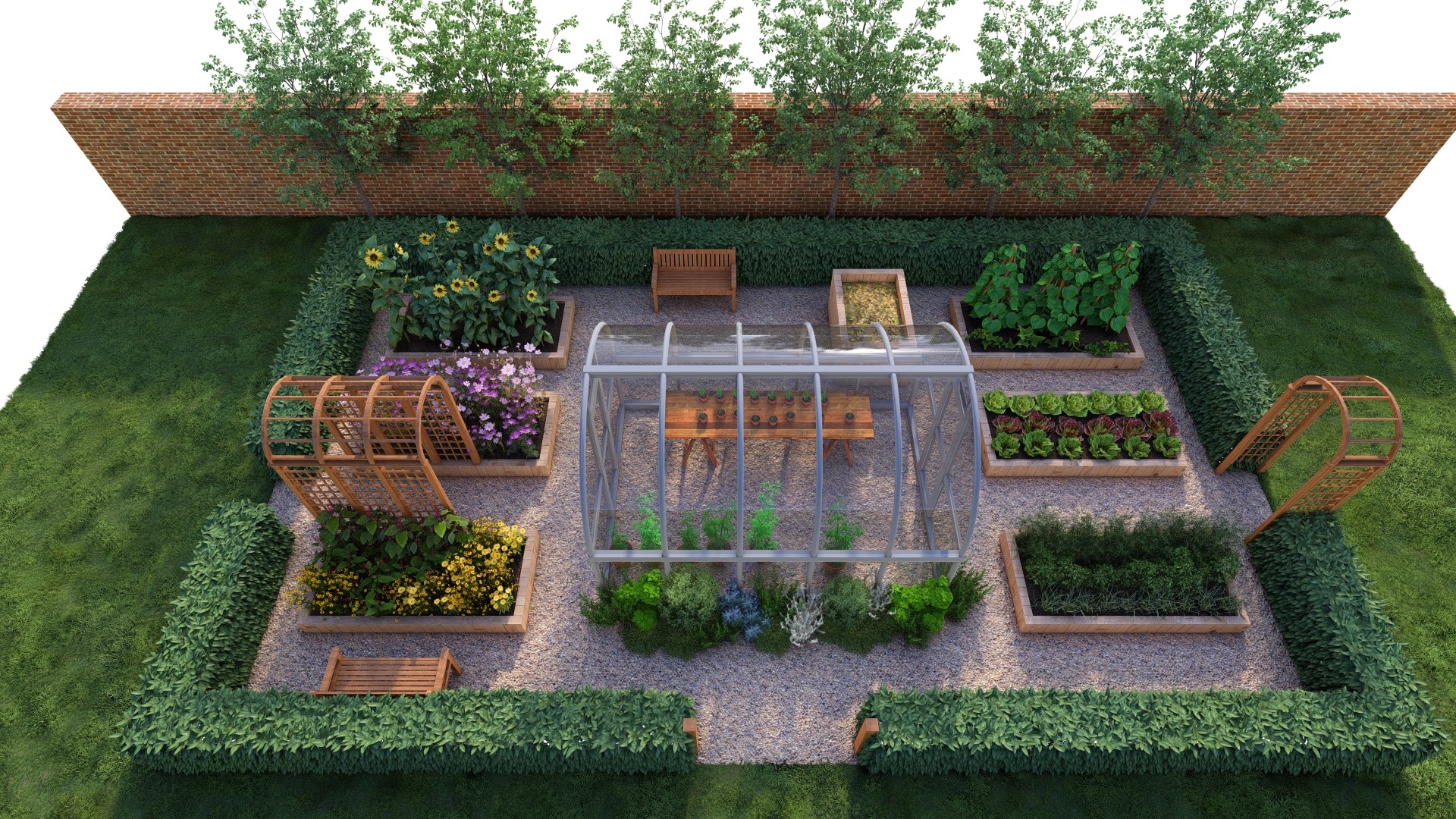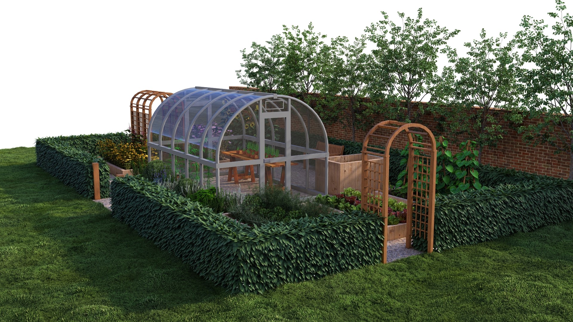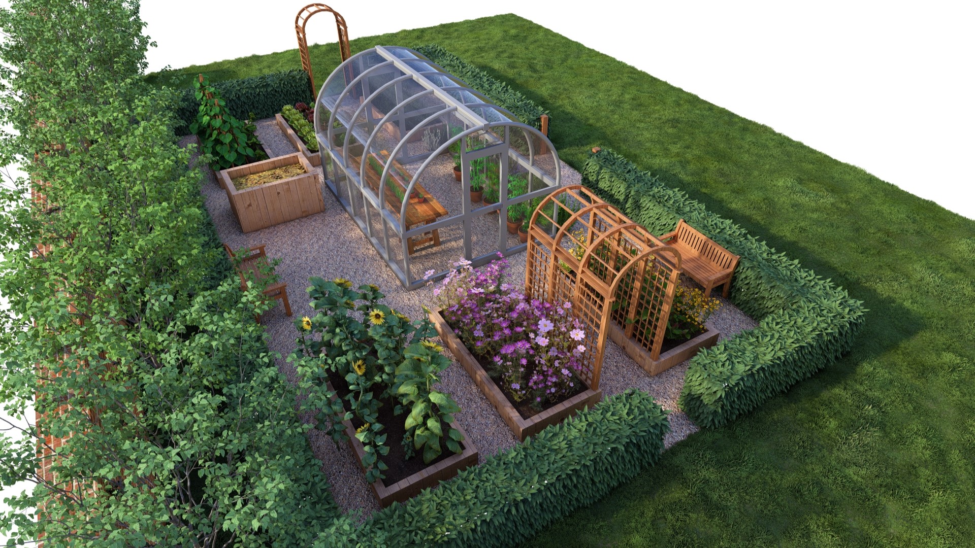 Warzywnik MIDI 7x12m- ze szklarnią i pergolą na ogórki